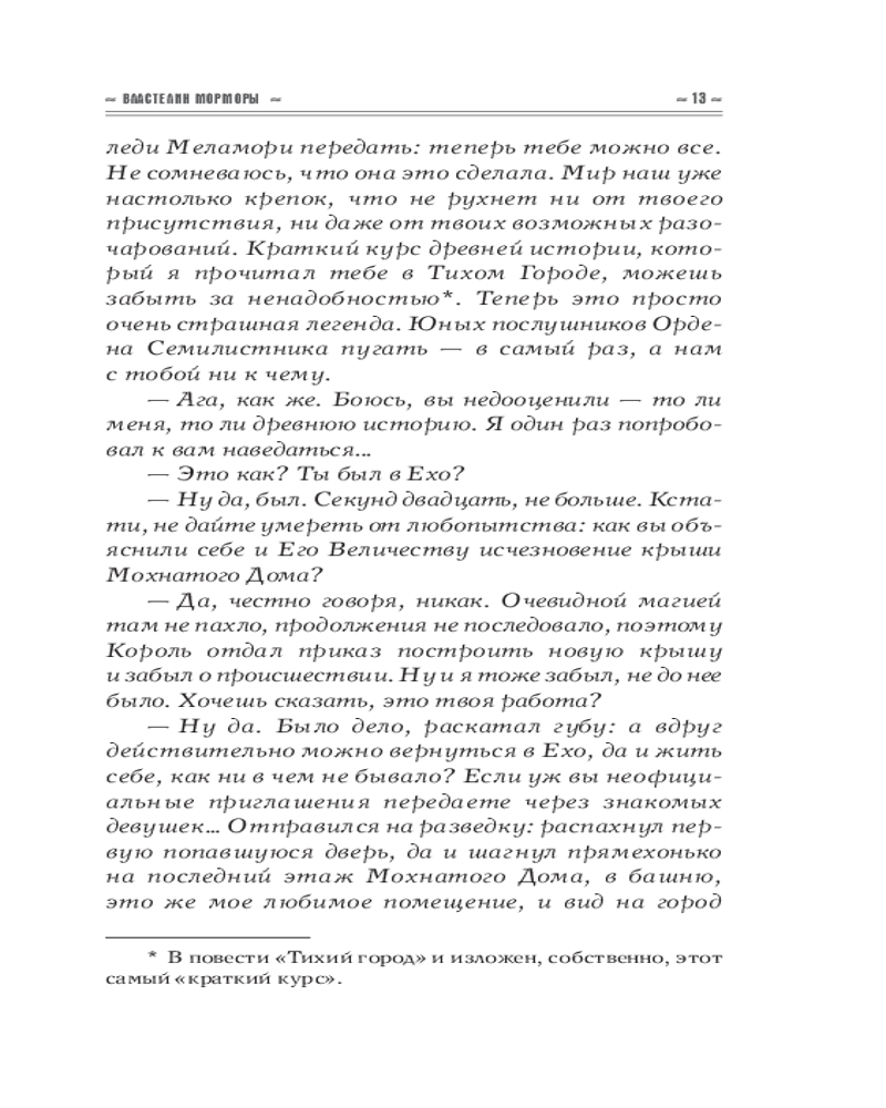 💳 Оплатить за товар можно при получении 🇰🇿 Есть бесплатная доставка по Казахстану 🎁 Копите бонусы с каждой покупки Серия: Хроники Ехо (илл. Ферез) Трактир «Кофейная гуща» стоит на границе между новорожденной реальностью и непознаваемым хаосом еще неосущественных возможностей. Он стал центральным местом действия цикла «Хроники Ехо», в ходе которого старые друзья и коллеги встречаются, чтобы поговорить о прошлом и помолчать о будущем, которое уже почти наступило. Во второй книге цикла «Хроники Ехо» свою историю рассказывает сэр Джуффин Халли — о беспомощности зла и способах победы над страхом. И о красиво сыгранной игре. |
