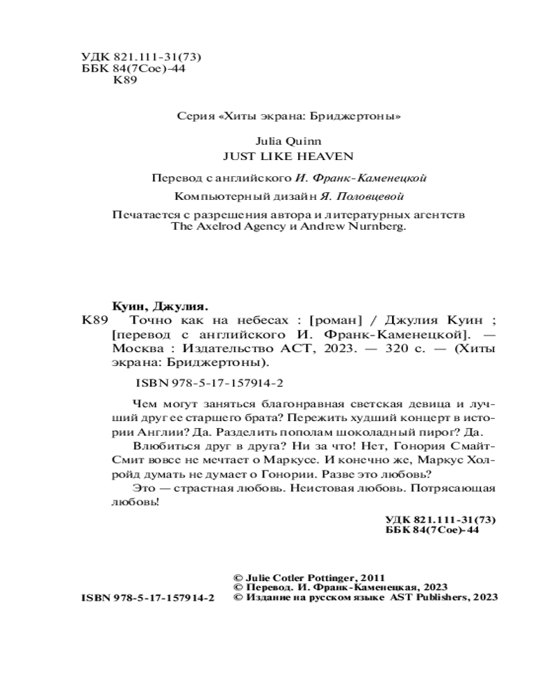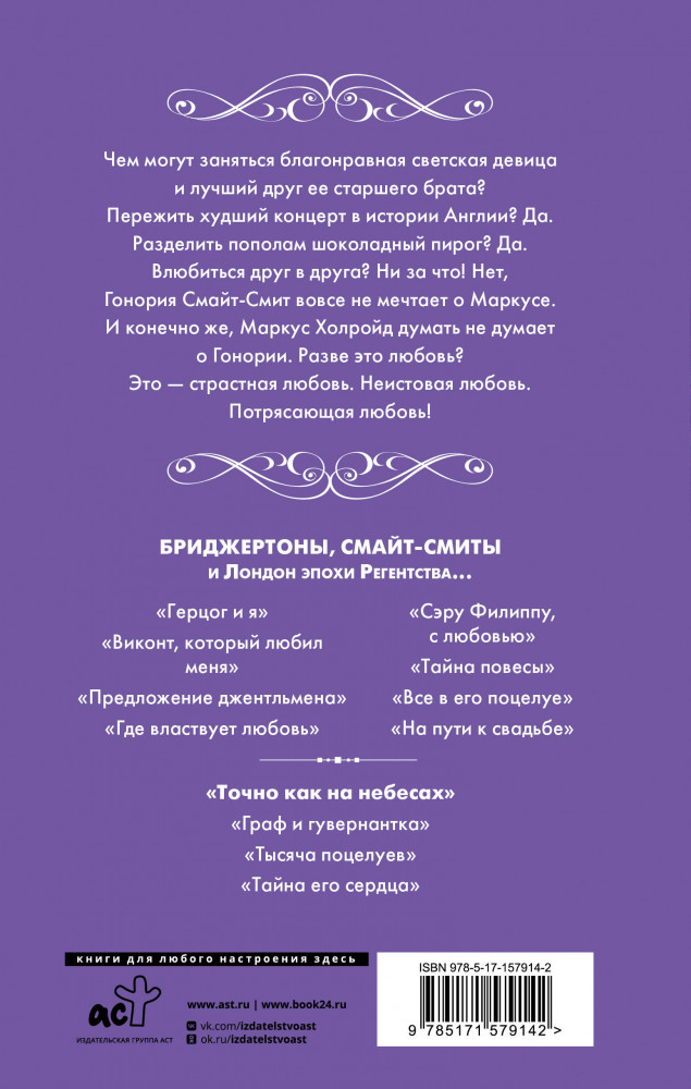 Точно как на небесахВ данный момент этот товар отсутствует в продаже. Возможно, у нас найдется аналогичный или похожий товар здесь. Серия: Бриджертоны и другие Чем могут заняться благонравная светская девица и лучший друг ее старшего брата? Пережить худший концерт в истории Англии? Да. Разделить пополам шоколадный торт? Да. Влюбиться друг в друга? Ни за что! Нет, Гонория Смайт-Смит вовсе не мечтает о Маркусе. И конечно же, Маркус Холройд думать не думает о Гонории. Разве это любовь? Это — страстная любовь. Неистовая любовь. Потрясающая любовь! |