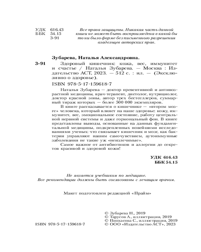 Серия: Эксклюзивно о здоровье Наталья Зубарева — доктор превентивной и антивозрастной медицины, врач-терапевт, диетолог, нутрициолог, доктор красной зоны, автор трех бестселлеров, суммарный тираж которых — более 500 000 экземпляров. В блоге Натальи Зубаревой, который читают почти пять миллионов подписчиков, — самые острые темы женского здоровья, бесценные советы и рекомендации, тысячи историй выздоровевших пациенток.