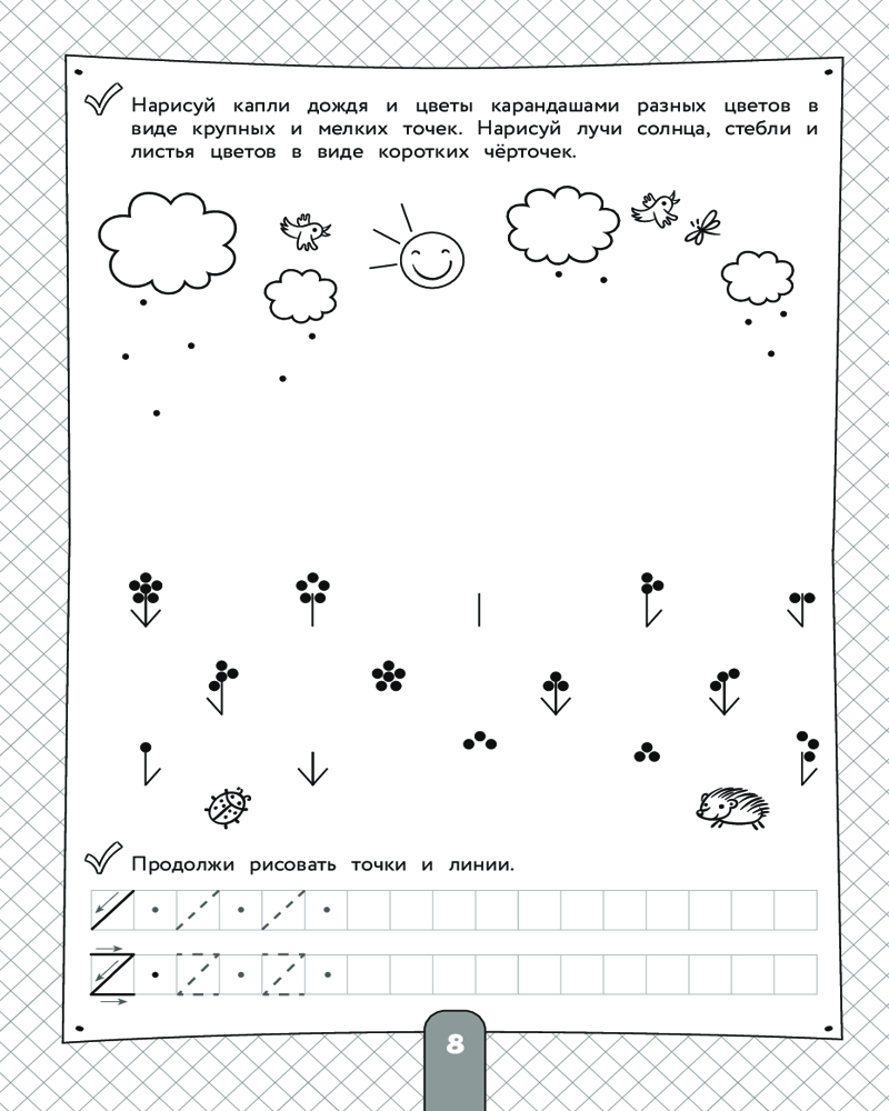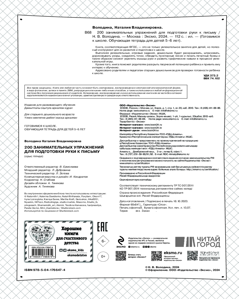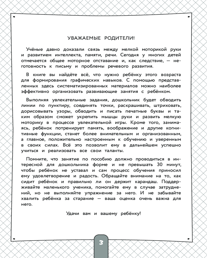 С помощью представленных в книге систематизированных материалов родители и педагоги смогут наиболее эффективно организовать обучение ребёнка. Выполняя увлекательные задания, дошкольник будет обводить линии по пунктиру, соединять точки, раскрашивать, штриховать, дорисовывать узоры, обводить и писать печатные буквы и таким образом сможет укрепить мышцы руки и развить графические навыки в процессе увлекательной игры. Всё это позволит ему в дальнейшем успешно учиться и реализовать все свои таланты. Кроме того, занимаясь, ребёнок станет более внимательным и организованным, а главное, положительно настроенным к обучению и уверенным в своих силах. Книга будет лучшим подарком ребёнку для подготовки к школе. |
