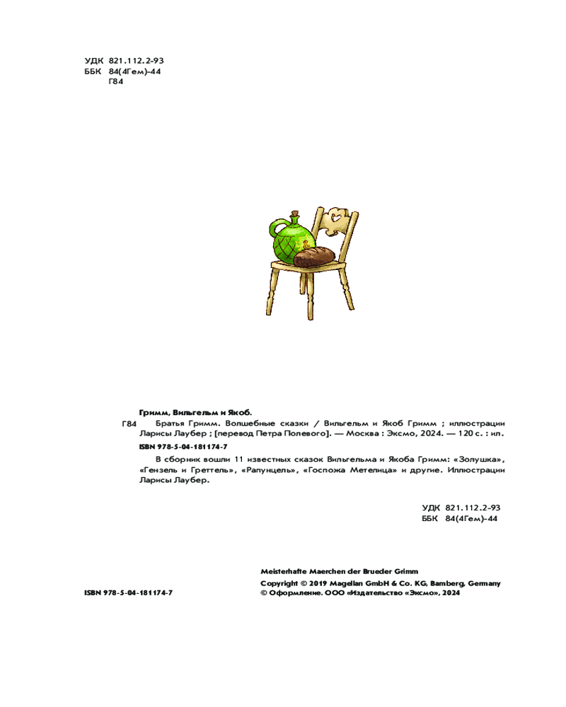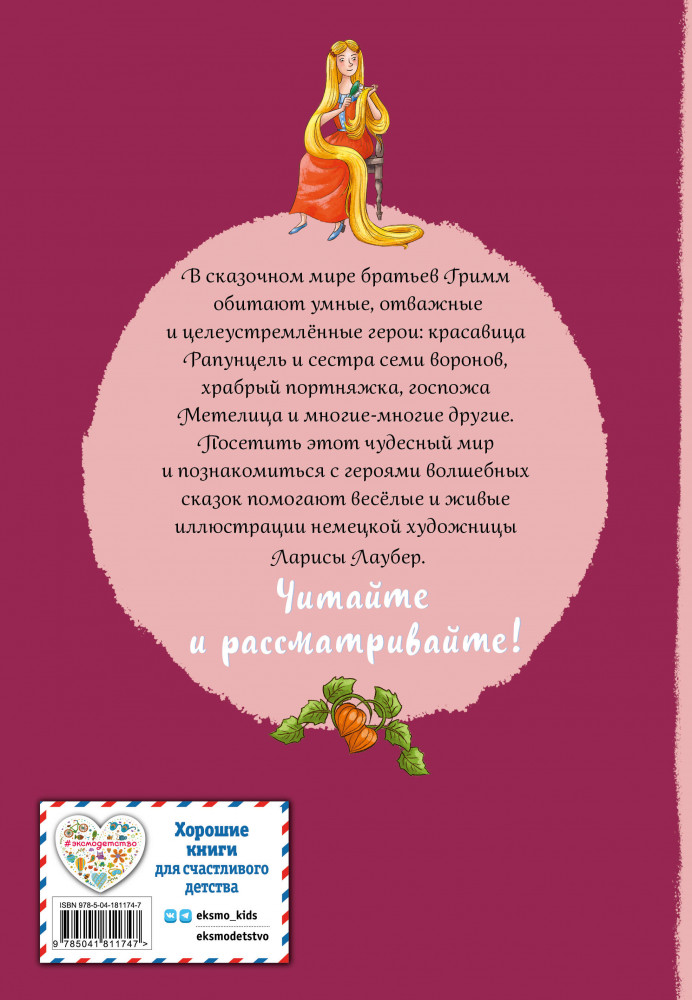 💳 Оплатить за товар можно при получении 🇰🇿 Есть бесплатная доставка по Казахстану от 1 дня 🎁 Копите бонусы с каждой покупки Серия: Золотые сказки для детей Старинные немецкие сказки, кропотливо собранные известными лингвистами Вильгельмом и Якобом Гримм, никого не оставляют равнодушным. Рапунцель и Золушка, храбрый портняжка и другие персонажи вдохновили известную немецкую художницу Ларису Лаубер на создание забавных, динамичных иллюстраций, близких и понятных современным детям. |