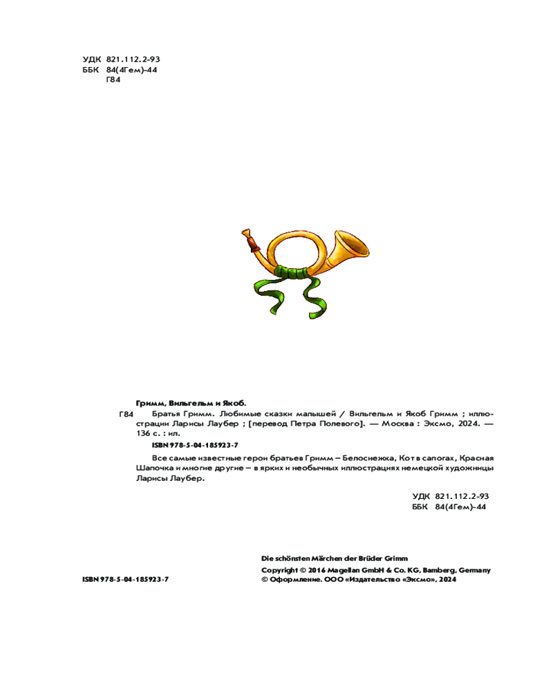 💳 Оплатить за товар можно при получении 🇰🇿 Есть бесплатная доставка по Казахстану от 1 дня 🎁 Копите бонусы с каждой покупки Серия: Золотые сказки для детей Все самые известные герои Братьев Гримм — Белоснежка, Кот в сапогах, Красная Шапочка и многие другие — в ярких и необычных иллюстрациях немецкой художницы Ларисы Лаубер. Детей привлекают чудеса и необыкновенные приключения героев, знакомые сюжеты, где добро непременно побеждает зло. Сборник «любимых сказок малышей» составлен для маленьких читателей, которые увлекаются сказками о приключениях зверей, необычных превращениях и находчивых героях. |
