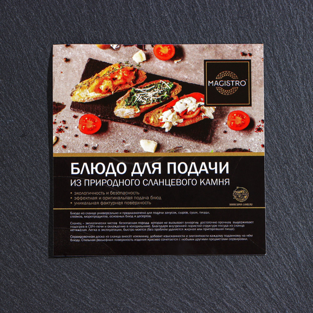 Magistro Доска для подачиВ данный момент этот товар отсутствует в продаже. Возможно, у нас найдется аналогичный или похожий товар здесь. Серия: Valley Доска из сланца универсально и предназначено для подачи закусок, сыров, суши, пиццы, стейков, морепродуктов, основных блюд и десертов. Сланец — экологически чистая безопасная порода, которая не вызывает аллергии. Достаточно прочная, выдерживает подогрев в СВЧ-печи и охлаждение в холодильнике. Благодаря внутренней пористой структуре посуда из сланца не тяжелая. Легка в эксплуатации, быстро моется (без проблем удаляется жирная или пригоревшая пища). Сервировочная доска из сланца внесет изюминку, добавит изысканности и элегантности каждому поданному на нем блюду. Стильная рельефная поверхность изделия красиво сочетается с любыми другими предметами сервировки. |