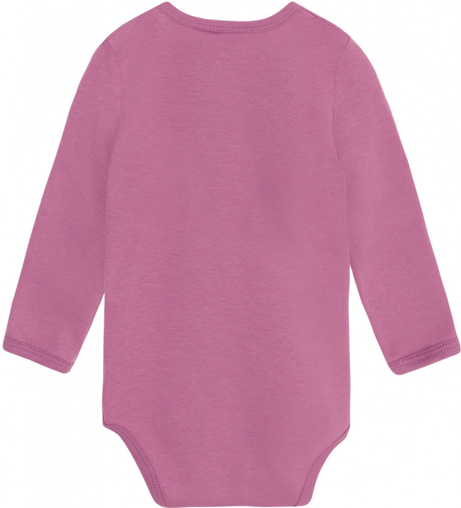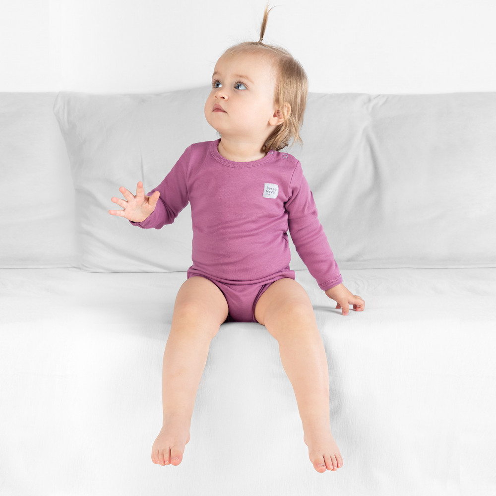 Бодики отличные, но почему-то разного размера, взяла оба на рост 86. Розовый меньше, фиолетовый больше. Один как раз, второй навырост)