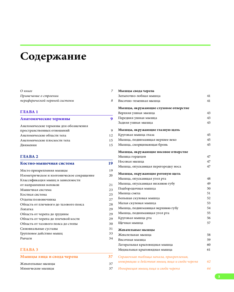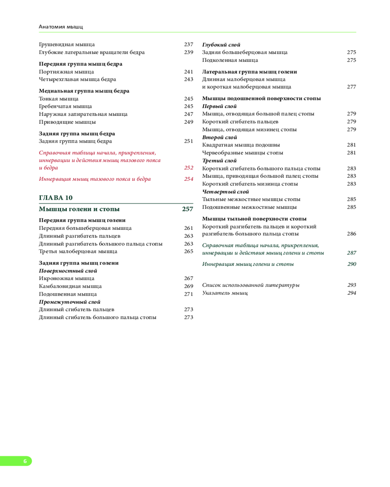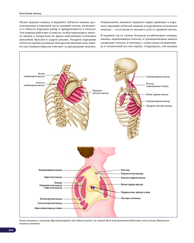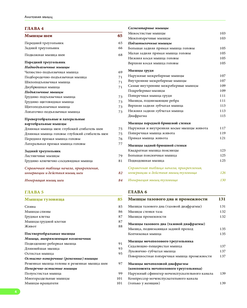 Каждая мышца описывается прикреплением, инервацией, биомеханикой, и базовые упражнения для этой мышцы