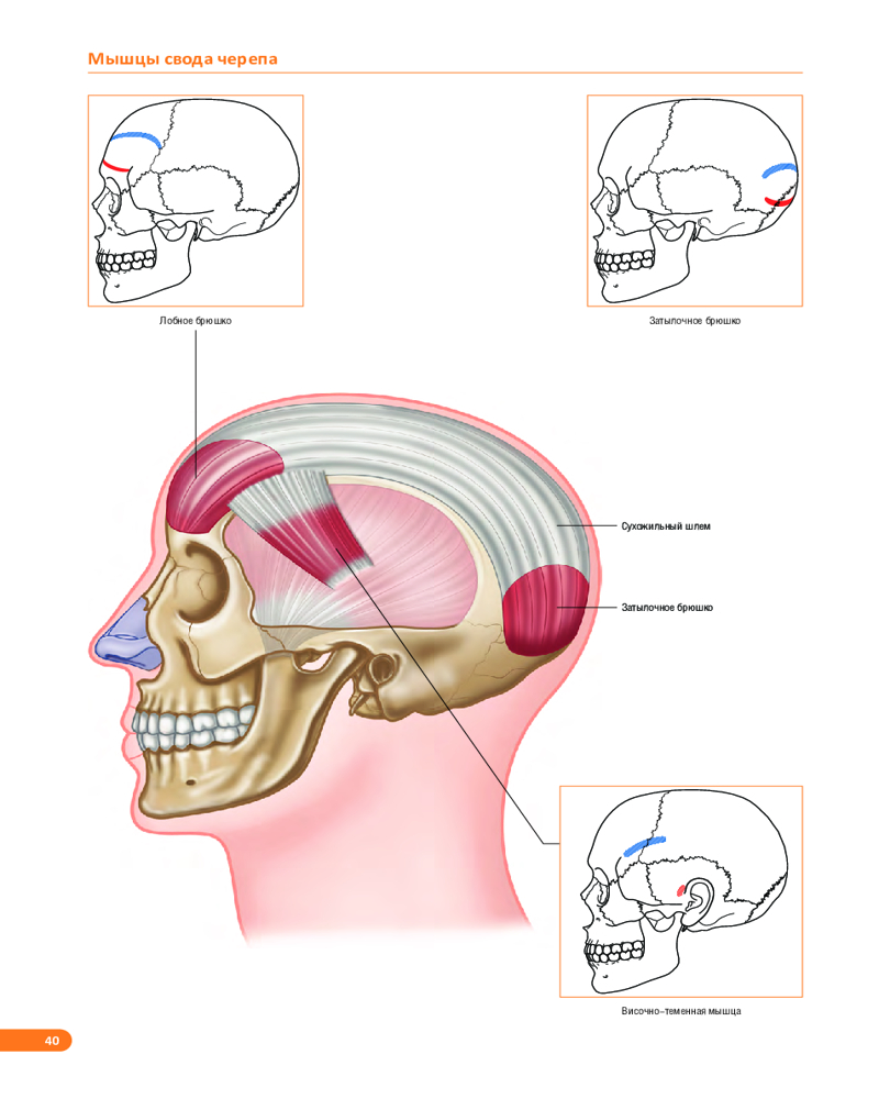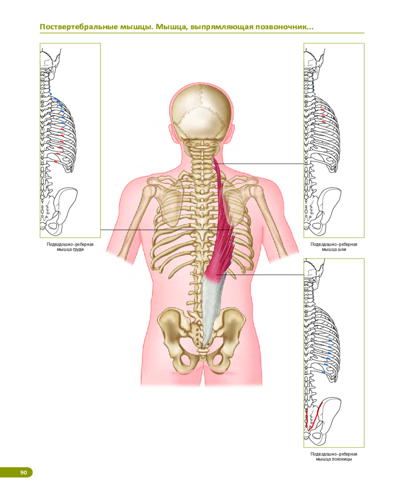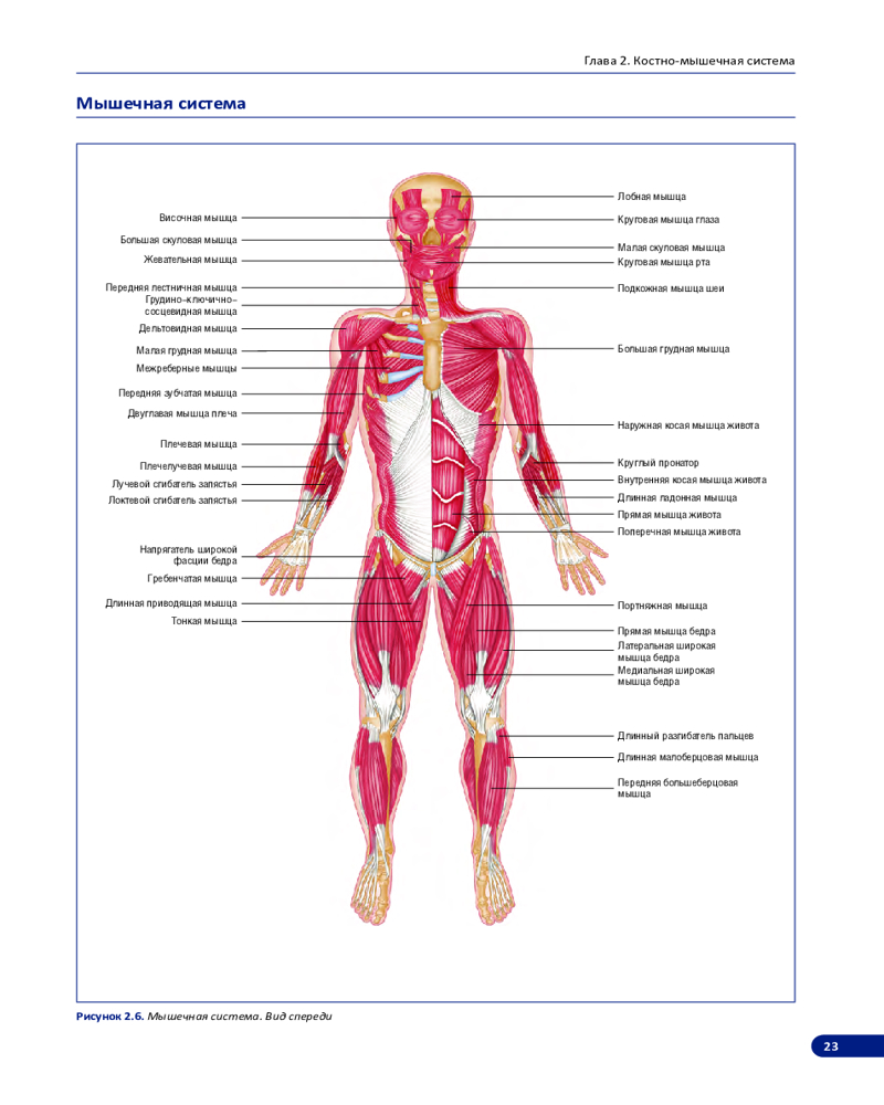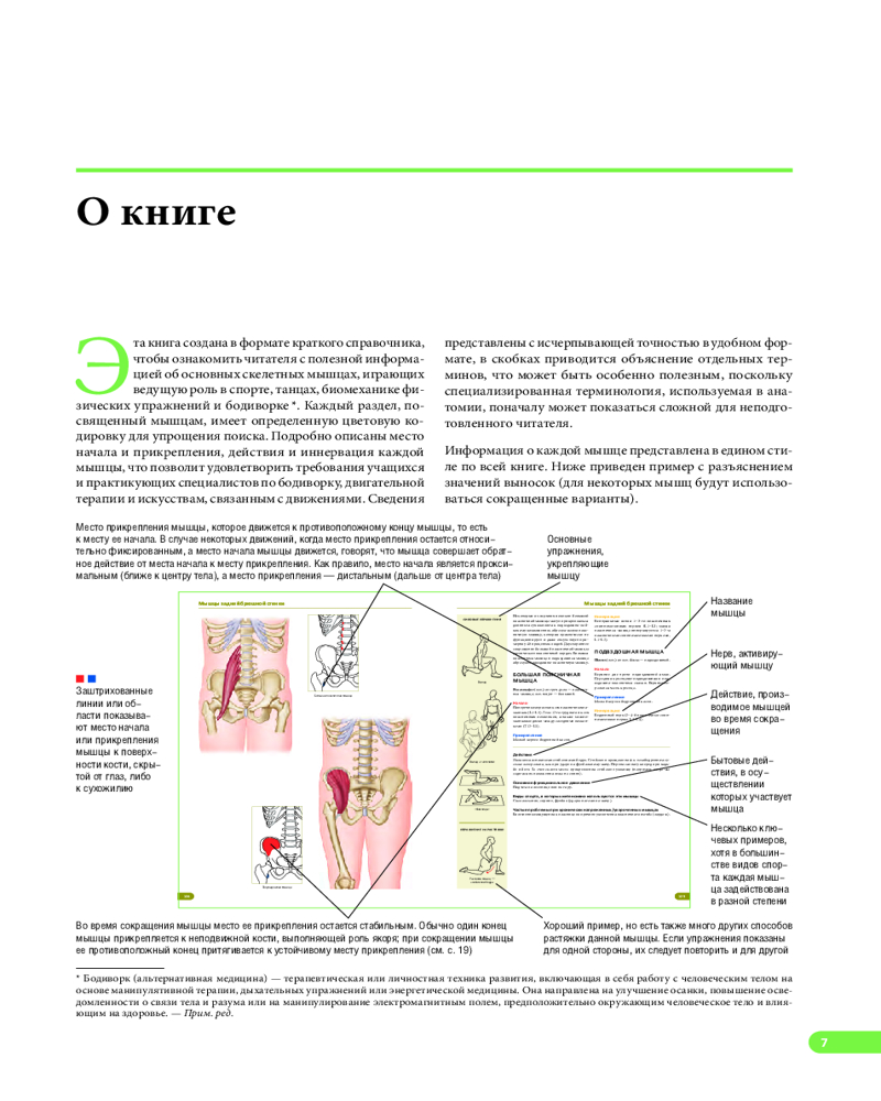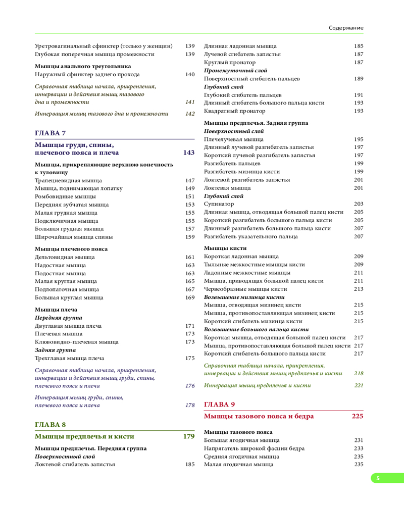 Каждая мышца описывается прикреплением, инервацией, биомеханикой, и базовые упражнения для этой мышцы