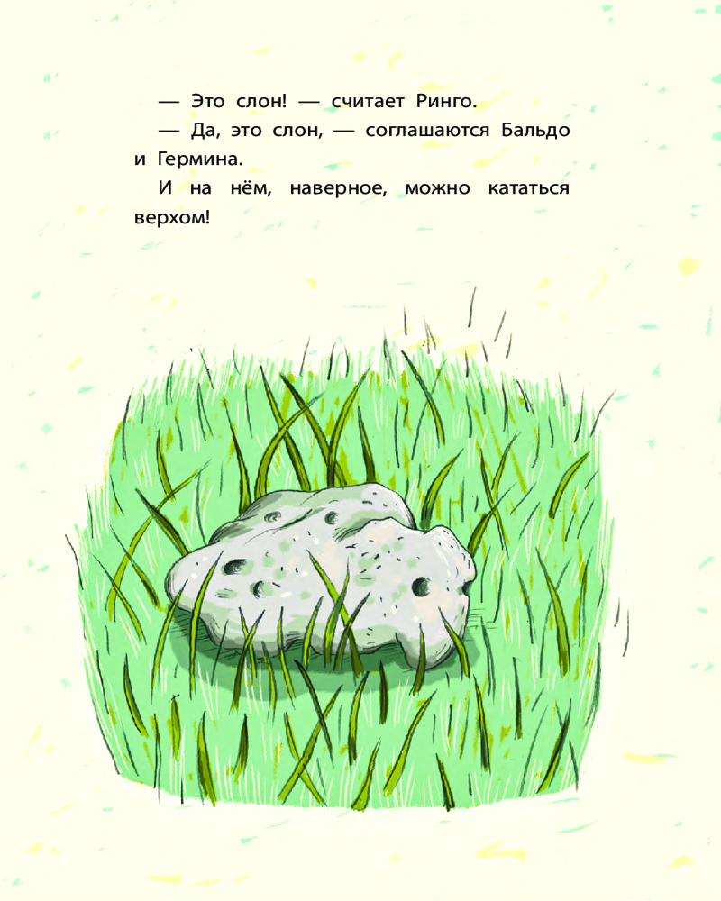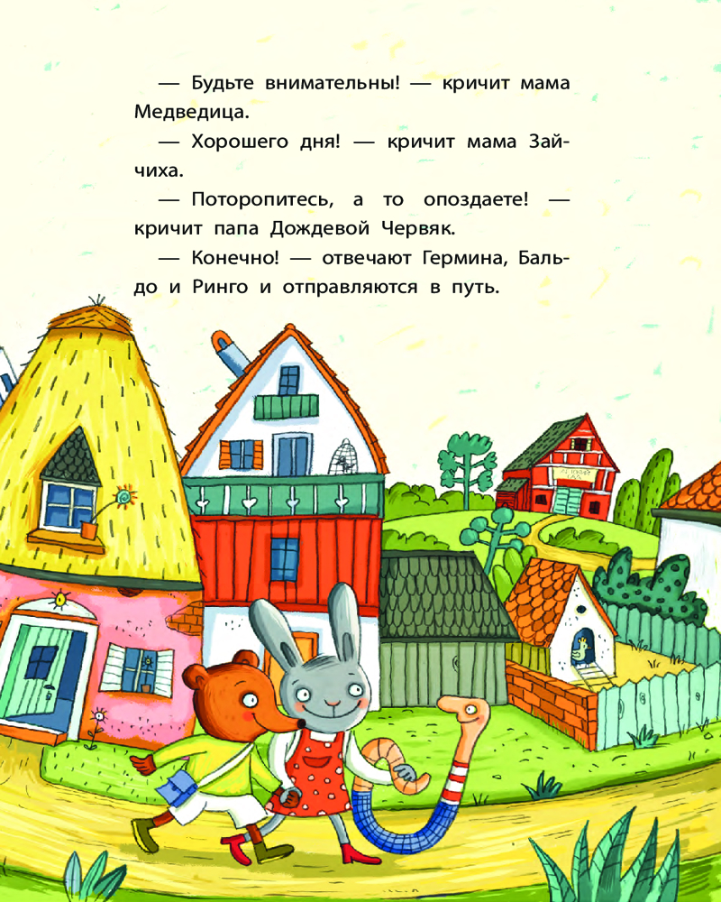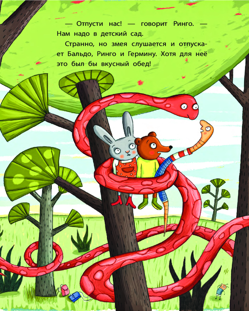 💳 Оплатить за товар можно при получении 🇰🇿 Есть бесплатная доставка по Казахстану от 1 дня 🎁 Копите бонусы с каждой покупки Однажды трое друзей — медвежонок Бальдо, червячок Ринго и зайчонок Гермина — отправились в детский сад одни. Садик очень близко от дома, им даже не придётся переходить дорогу. Но кто бы мог подумать, сколько всего необычного можно встретить по пути! Большой камень на самом деле оказывается слоном, который везёт друзей через джунгли. Смятая салфетка — огромная птица, на которой можно взлететь в небо. А вот эта старая прищепка — страшный крокодил... |