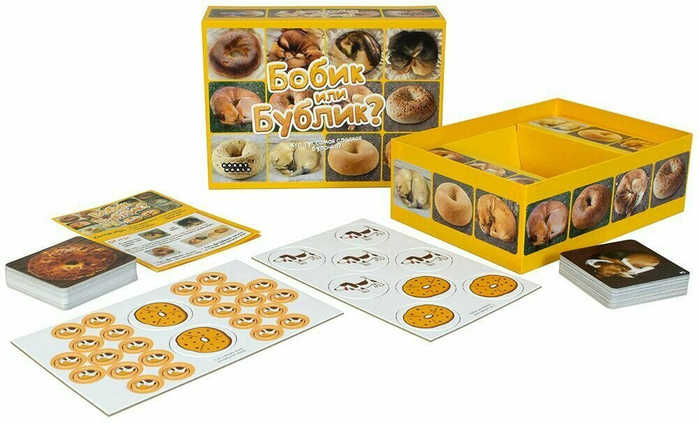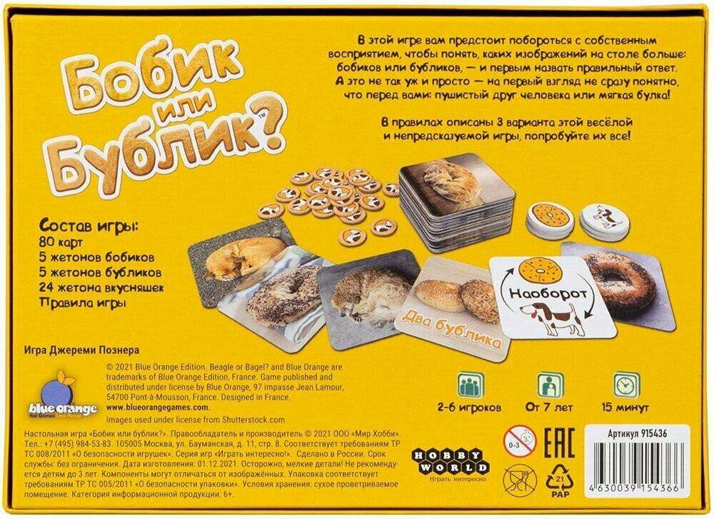 Hobby World Игра настольная «Бобик или бублик?»В данный момент этот товар отсутствует в продаже. Возможно, у нас найдется аналогичный или похожий товар здесь. В этой игре вам предстоит побороться с собственным восприятием, чтобы понять, каких изображений на столе больше: бобиков или бубликов, — и первым назвать правильный ответ. А это не так уж и просто — на первый взгляд не сразу понятно, что перед вами: пушистый друг человека или мягкая булка! В правилах описаны 3 варианта этой веселой и непредсказуемой игры, попробуйте их все! Веселая настольная игра, которая отлично подойдет для семьи или компании друзей. В правилах можно найти три варианта игры. Игрокам предстоит проверить зрительное восприятие забавными и непредсказуемыми способами, а также натренировать остроту внимания. Карточки с самыми аппетитными собаками и милыми булочками разбавляются остроумными жетонами вкусняшек. |