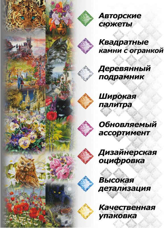 Покупая алмазную мозаику от Белоснежка вы можете быть уверены, что только у нас в наборах осуществлено блестящее воспроизведение оригинала, так как мы используем только оригинальные авторские работы и качественную оцифровку изображения с мельчайшей детализацией. Все это нам позволило сделать блестящее воспроизведение оригинала работы художника, а благодаря большому количеству цветов камней в комплекте мы добились максимальной достоверности изображения. Качественные многогранные камни придают изображению блеск, усиливают отражение и преломление света, не выцветают, что и дает требуемое воспроизведение оригинала произведения.