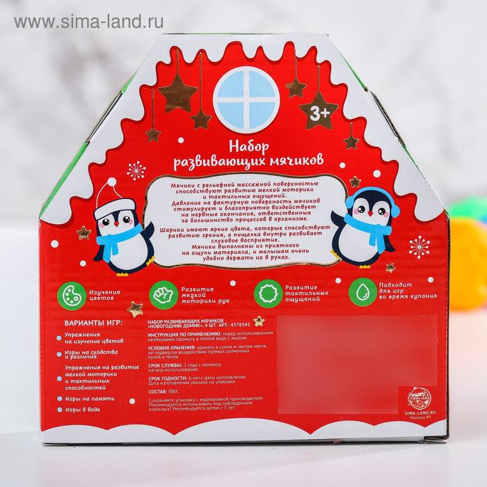 Mum&Baby Набор подарочный «Новогодний домик»В данный момент этот товар отсутствует в продаже. Возможно, у нас найдется аналогичный или похожий товар здесь. Серия: Новый год для малышей Мячики с рельефной массажной поверхностью способствуют развитию мелкой моторики и тактильных ощущений. Давление на фактурную поверхность мячиков стимулирует и благоприятно воздействует на нервные окончания, ответственные за большинство процессов в организме. Шарики имеют яркие цвета, которые способствуют развитию зрения, а пищалка внутри развивает слуховое восприятие. Мячики выполнены из приятного на ощупь материала, и малышам очень удобно держать их в руках. |