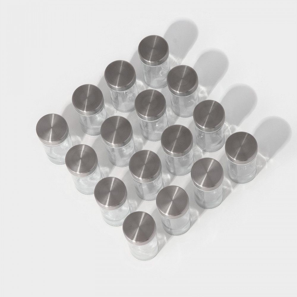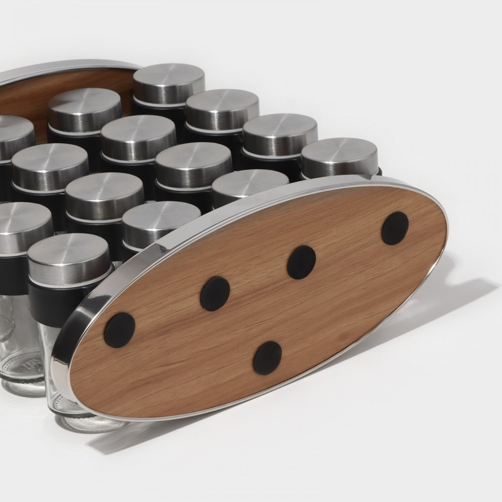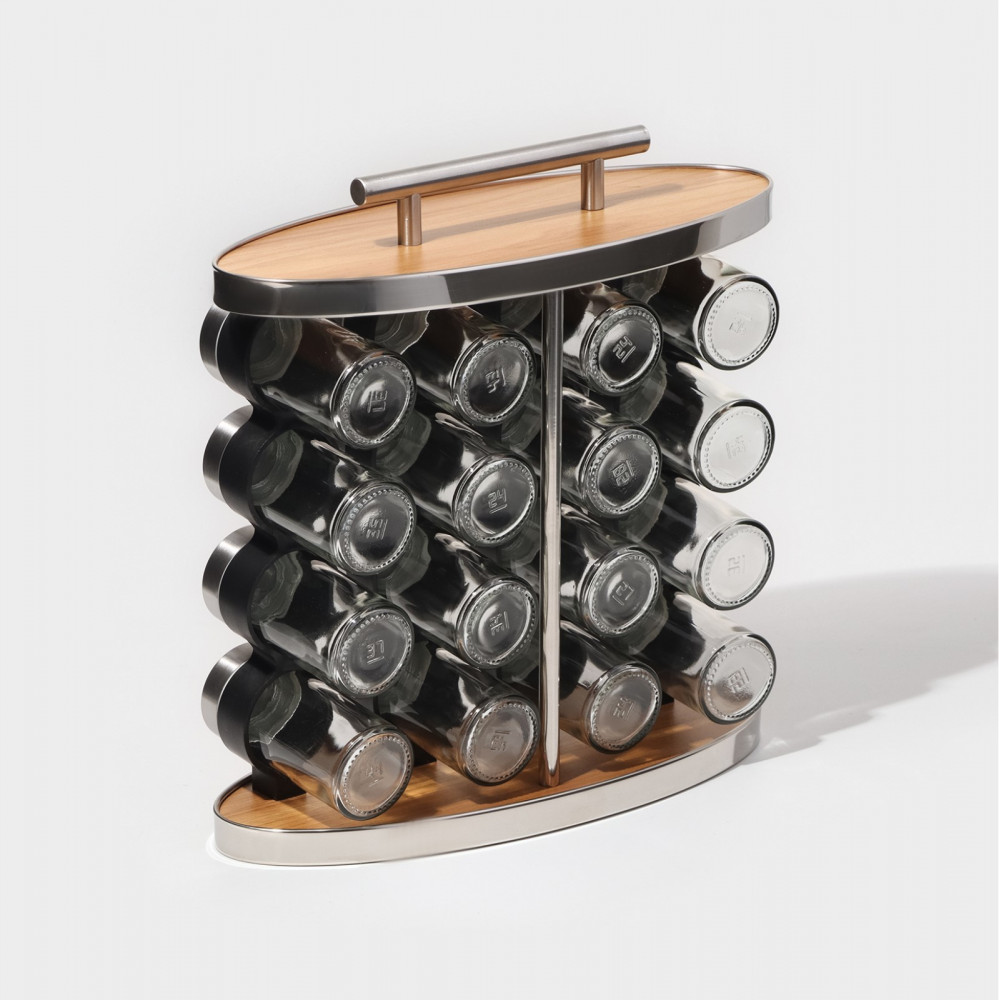 Набор для специй на подставке «Модерн». В наборе 16 баночек для специй на подставке. Подставка выполнена из МДФ и металла, баночки из стекла. Благодаря подставке с ручкой, специи не займут много места и легко переносятся на сервированный стол.