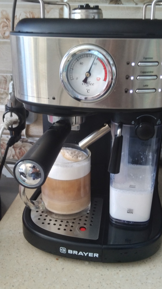 Кофеварка мне понравилась. Автоматически взбивает крепкую пенку, кофе получается очень вкусным и горячим. Капучинатор зверь, поставила латте, пенку на максимум, так порция не вошла в пол литровую кружку, пенка полилась через край. Теперь только на минимуме готовлю и капучино тоже. На фото двойной капучино. Надеюсь прослужит долго. Спасибо большое Flip, за хороший товар и хорошую скидку!