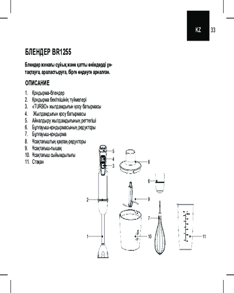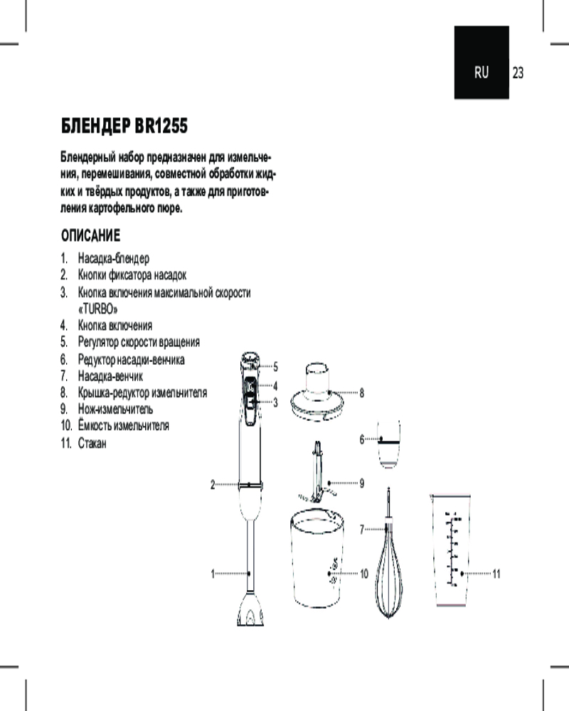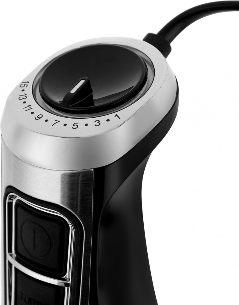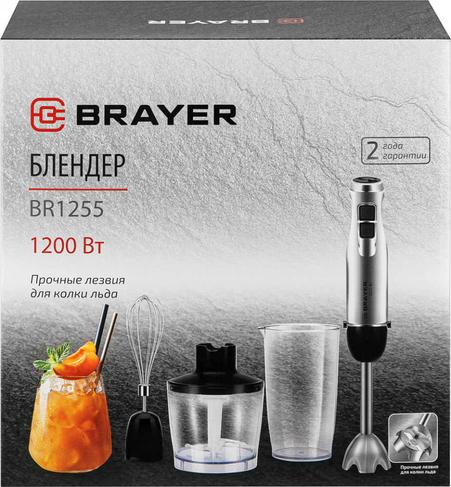 Погружной блендер с мощностью 1200 Вт поможет Вам приготовить разнообразные блюда. У блендера BR1255, 5 скоростей, а также есть функция Турборежима, благодаря чему Вы сможете как взбить тесто, так и перемолоть орехи в измельчителе.