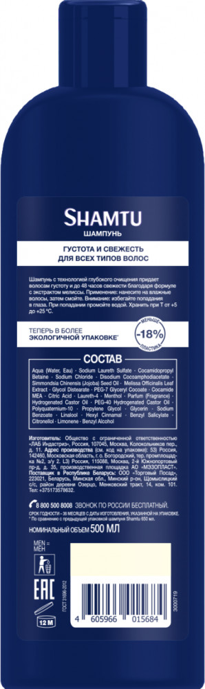 Shamtu Шампунь для волос с экстрактом мелиссы «Густота и свежесть»