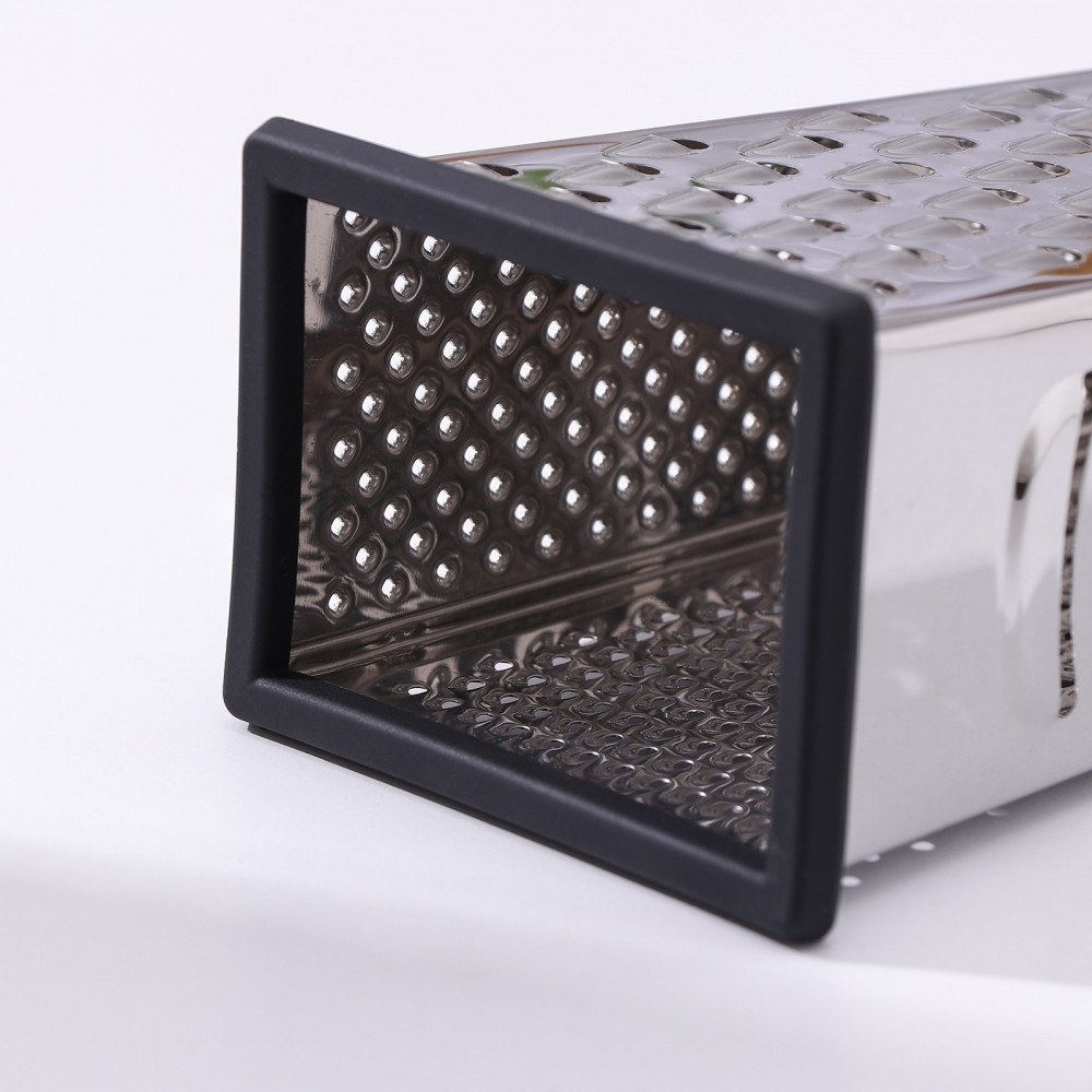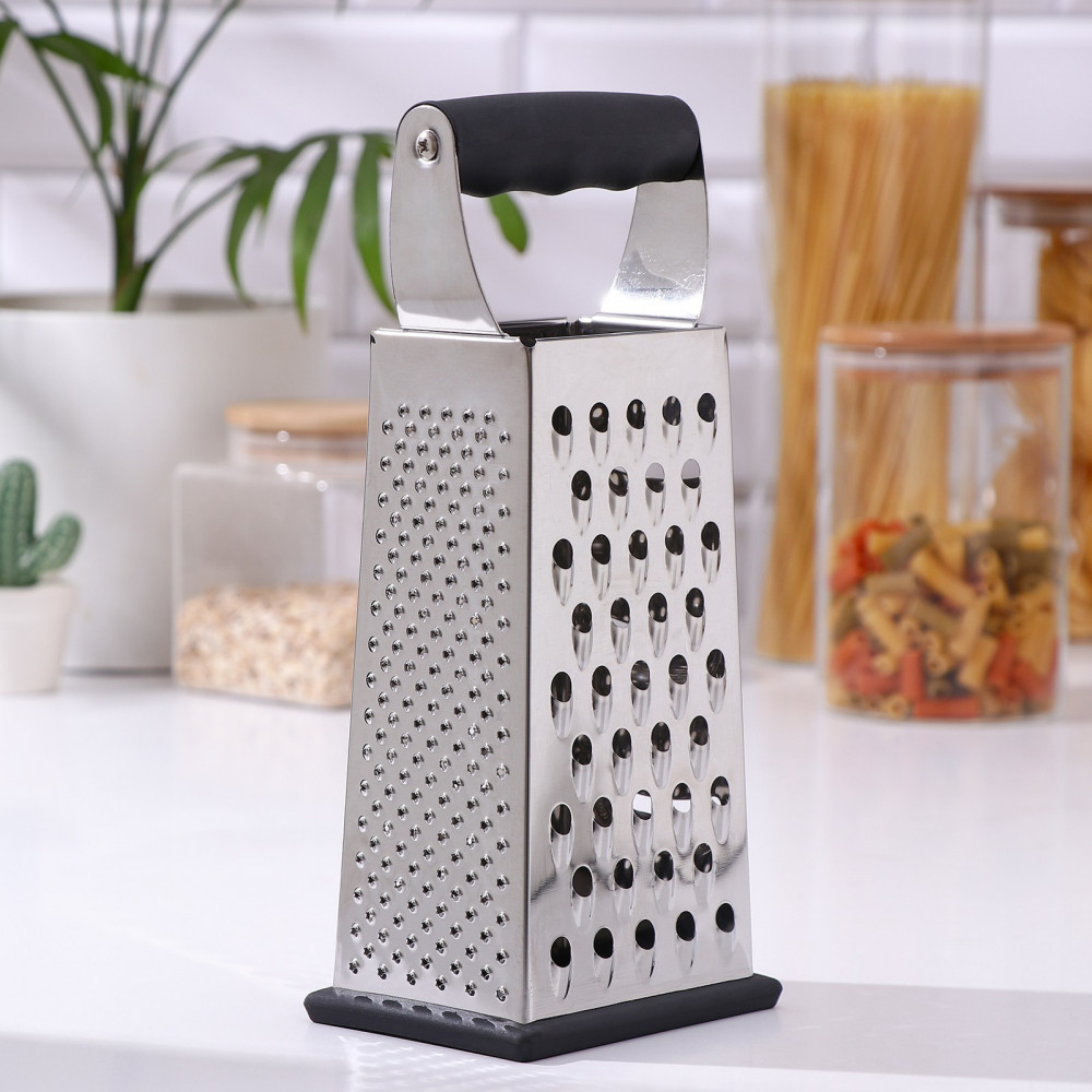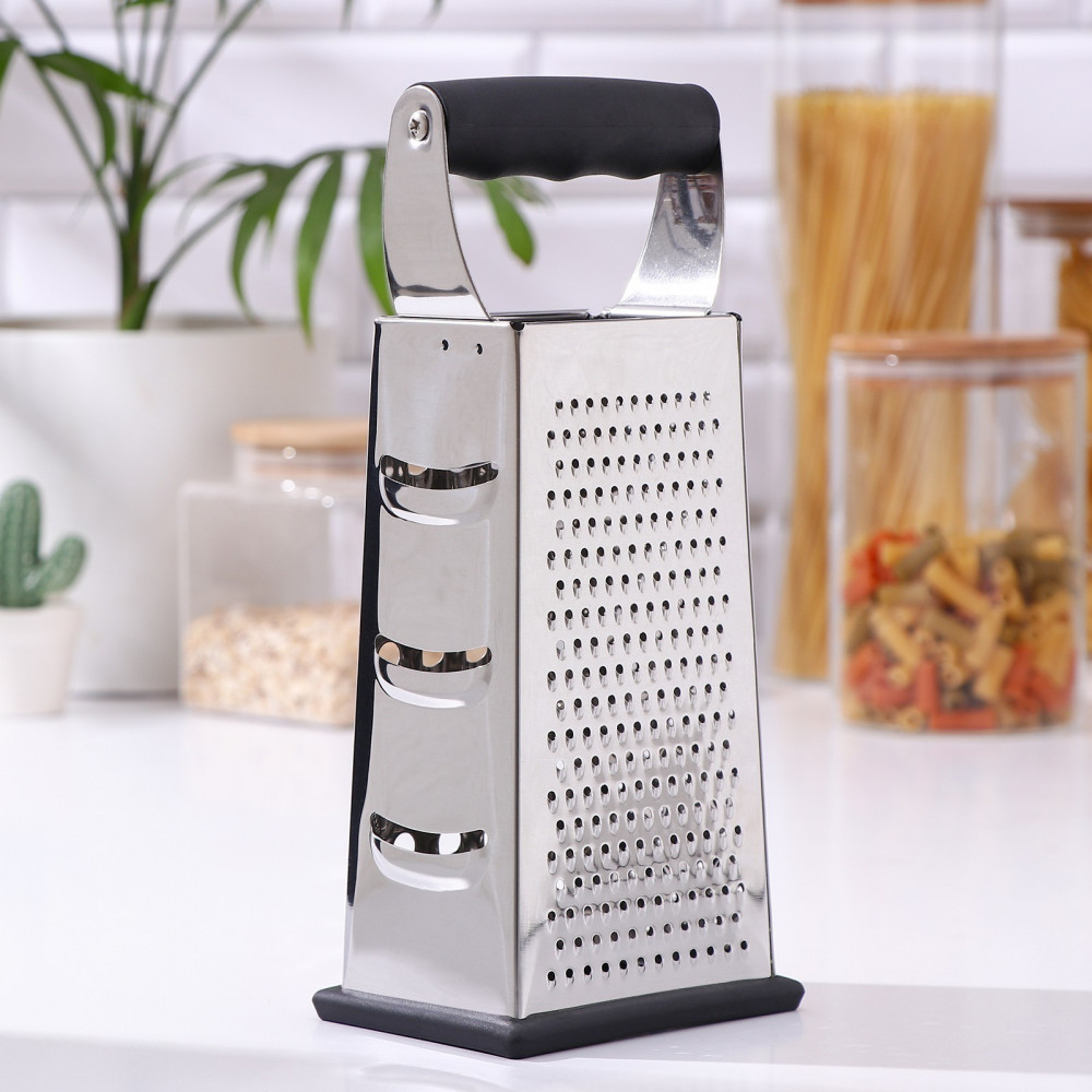 Четырехгранная терка, выполненная из нержавеющей стали, станет незаменимым атрибутом приготовления пищи. На одном изделии представлены четыре вида терок — крупная терка, средняя терка, мелкая терка и шинковка. Классический дизайн позволит терке занять достойное место на Вашей кухне и прекрасно впишется в любой кухонный интерьер.