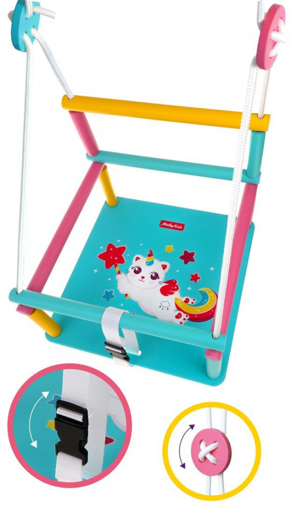 Детские качели «Комета» прекрасно подойдут для активного отдыха ребенка. Качели имеют сплошное широкое деревянное сиденье со специальным детским привлекательным дизайном. Размеры сиденья 33×32 см — обеспечивают удобную посадку ребенка и полный комфорт при качании. У данной модели на сиденье изображен Котёнок — любимый всеми детьми персонаж.