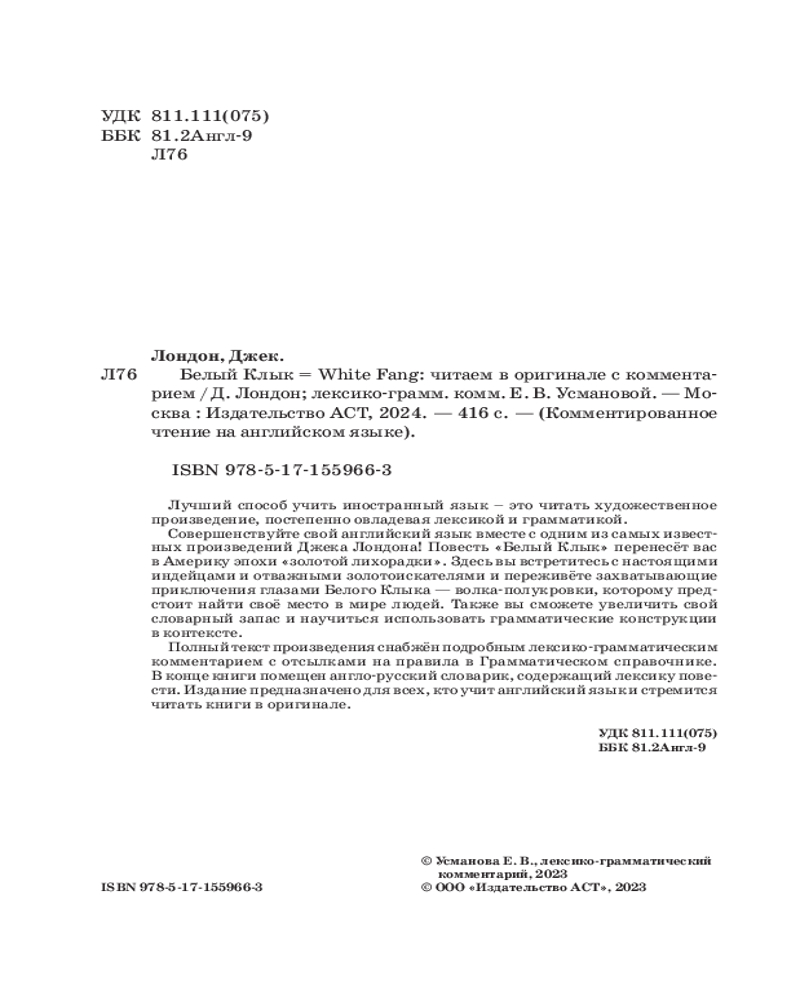 💳 Оплатить за товар можно при получении 🇰🇿 Есть бесплатная доставка по Казахстану от 1 дня 🎁 Копите бонусы с каждой покупки Серия: Комментированное чтение на английском языке Лучший способ учить иностранный язык — это читать художественное произведение, постепенно овладевая лексикой и грамматикой. Совершенствуйте свой английский язык вместе с одним из самых известных произведений Джека Лондона! Повесть «Белый Клык» перенесёт вас в Америку эпохи «золотой лихорадки». Здесь вы встретитесь с настоящими индейцами и отважными золотоискателями и переживёте захватывающие приключения глазами Белого Клыка — волка-полукровки, которому предстоит найти своё место в мире людей. Также вы сможете увеличить свой словарный запас и научиться использовать грамматические конструкции в контексте. |