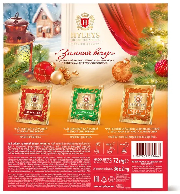 Hyleys Чай ассорти «Зимний вечер»В данный момент этот товар отсутствует в продаже. Возможно, у нас найдется аналогичный или похожий товар здесь. Прекрасный и достойный подарок в яркой праздничной упаковке к Новому году и Рождеству для родных и близких! Каждый пакетик в индивидуальном фольгированном саше, что позволяет сохранить и донести до каждого почитателя чая Hyleys аромат и несравненный вкус этого напитка. |