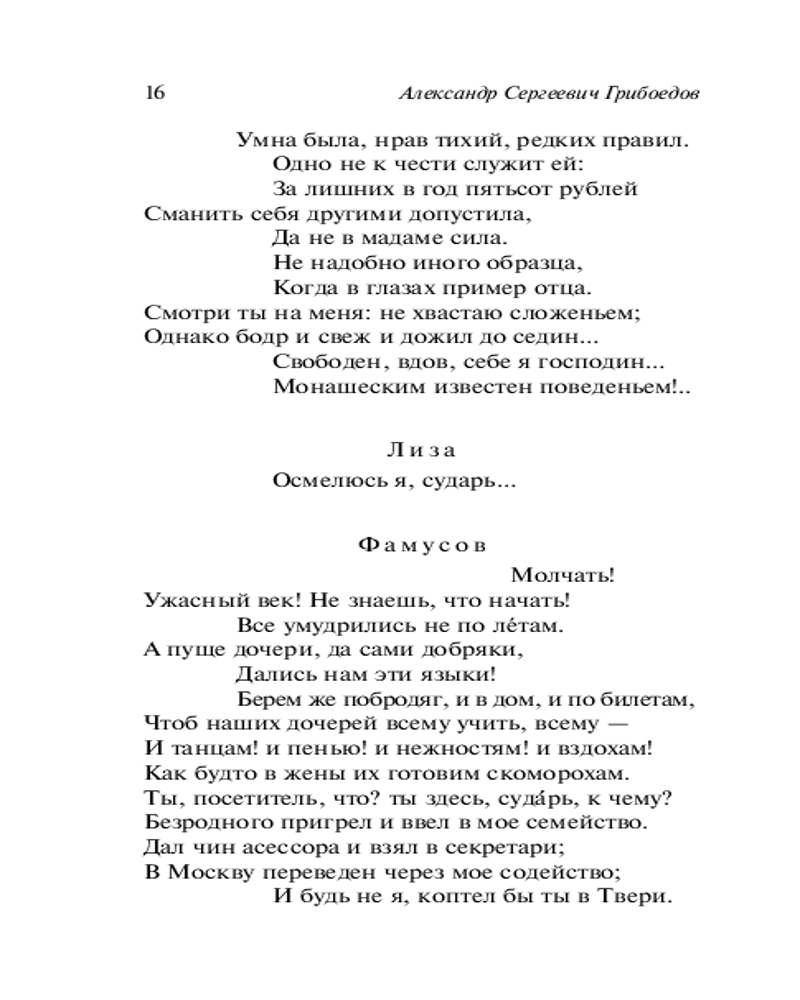 Горе от ума. НедоросльВ данный момент этот товар отсутствует в продаже. Возможно, у нас найдется аналогичный или похожий товар здесь. Серия: Книга на все времена (нов/м) «Горе от ума» — шедевр русской литературы, произведение, разобранное на цитаты и крылатые фразы чуть ли не от первого до последнего слова. «Собрать бы книги все да сжечь», «Карету мне, карету», «В деревню, к тетке, в глушь, в Саратов», «Она к нему — а он ко мне»... Мы используем фразы из «Горя от ума» настолько часто, что даже не осознаем, что это — цитаты. Не потому ли горькая, язвительная и блестящая комедия Грибоедова по-прежнему актуальна и по сей день не сходит с лучших театральных сцен нашей страны?.. |