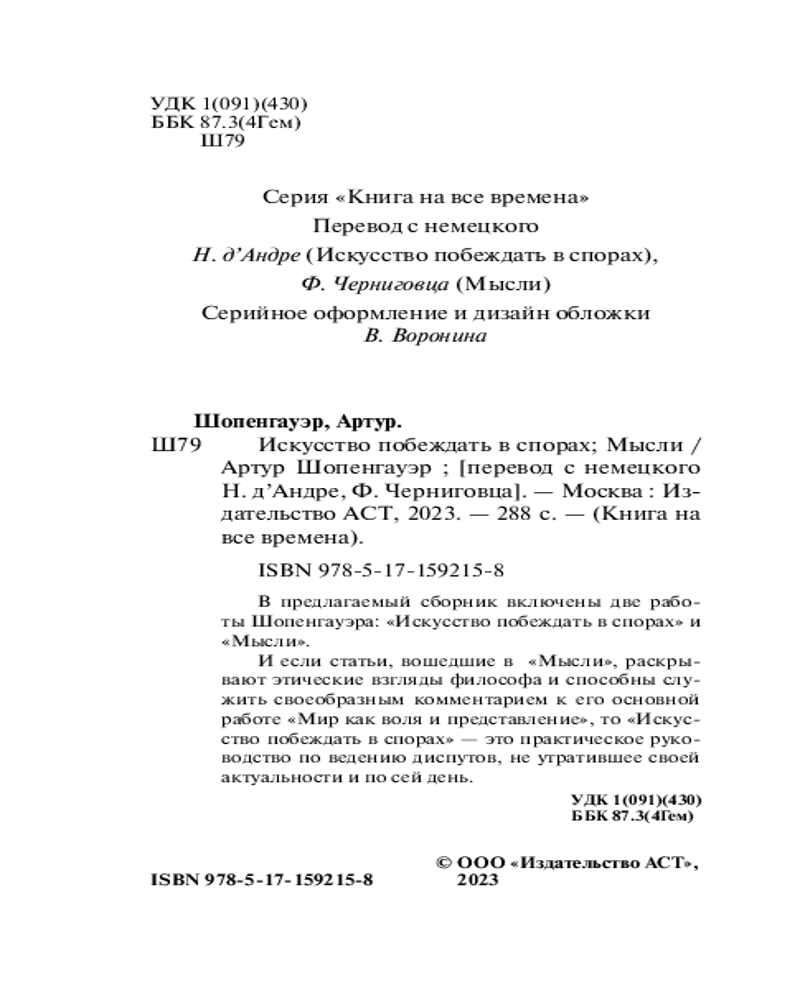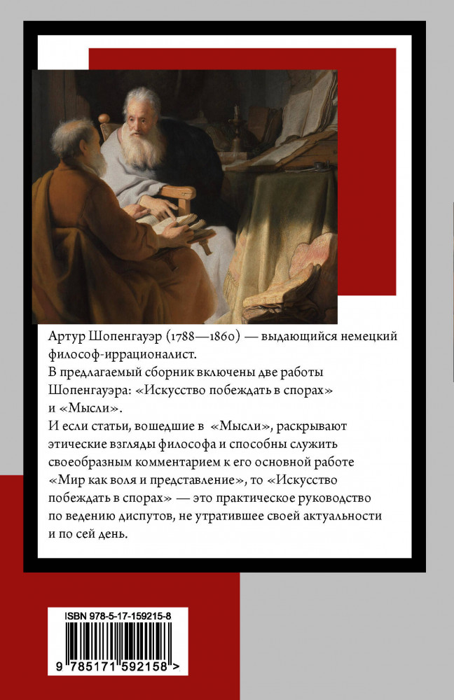 💳 Оплатить за товар можно при получении 🇰🇿 Есть бесплатная доставка по Казахстану от 1 дня 🎁 Копите бонусы с каждой покупки Серия: Книга на все времена (нов/м) В предлагаемый сборник включены две работы Шопенгауэра: «Искусство побеждать в спорах» и «Мысли». И если статьи, вошедшие в «Мысли», раскрывают этические взгляды философа и способны служить своеобразным комментарием к его основной работе — «Мир как воля и представление», то «Искусство побеждать в спорах» — это практическое руководство по ведению диспутов не утратившее своей актуальности и по сей день. |