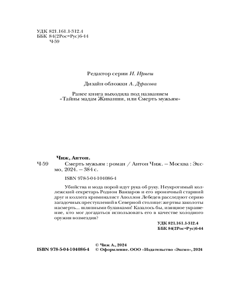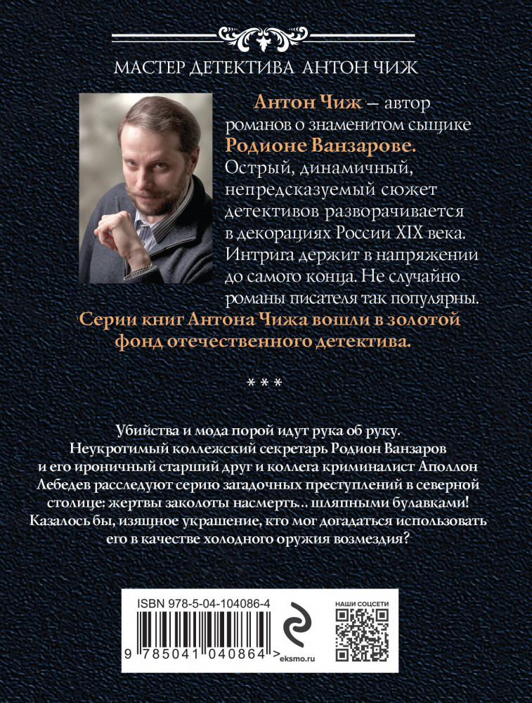 В данный момент этот товар отсутствует в продаже. Возможно, у нас найдется аналогичный или похожий товар здесь. Серия: Исторические детективы Антона Чижа (обложка) Убийства и мода порой идут рука об руку. Неукротимый коллежский секретарь Родион Ванзаров и его ироничный старший друг и коллега криминалист Аполлон Лебедев расследуют серию загадочных преступлений в северной столице: жертвы заколоты насмерть... шляпными булавками! Казалось бы, изящное украшение, кто мог догадаться использовать его в качестве холодного оружия возмездия?