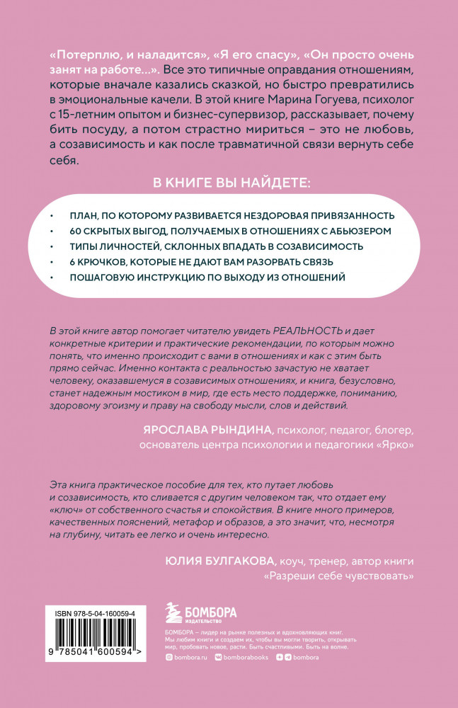 💳 Оплатить за товар можно при получении 🇰🇿 Есть бесплатная доставка по Казахстану от 1 дня 🎁 Копите бонусы с каждой покупки Серия: Хиты саморазвития «Потерплю и наладится», «Я его спасу», «Он просто очень занят на работе...». Все это типичные оправдания отношениям, которые вначале казались сказкой, но быстро превратились в эмоциональные качели. В этой книге Марина Гогуева, психолог с 15-летним опытом и бизнес-супервизор, рассказывает, почему бить посуду, а потом страстно мириться — это не любовь, а созависимость и как после травматичной связи вернуть себе себя. |