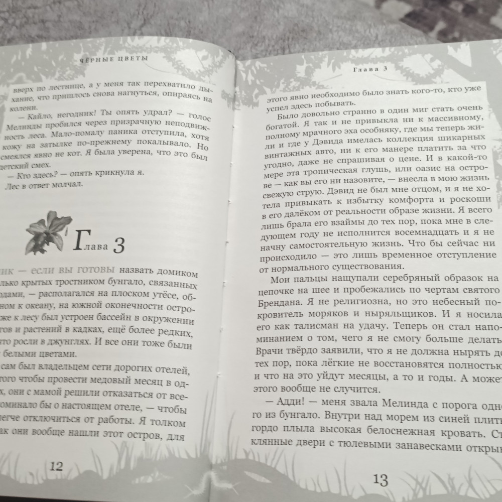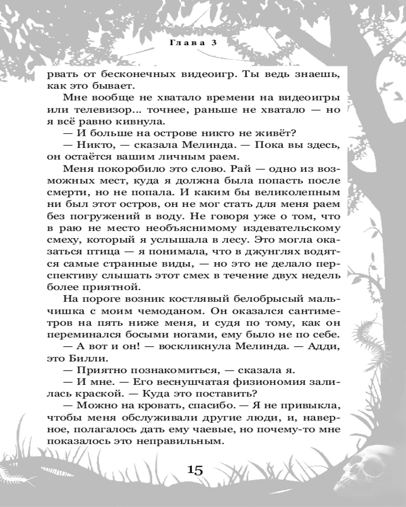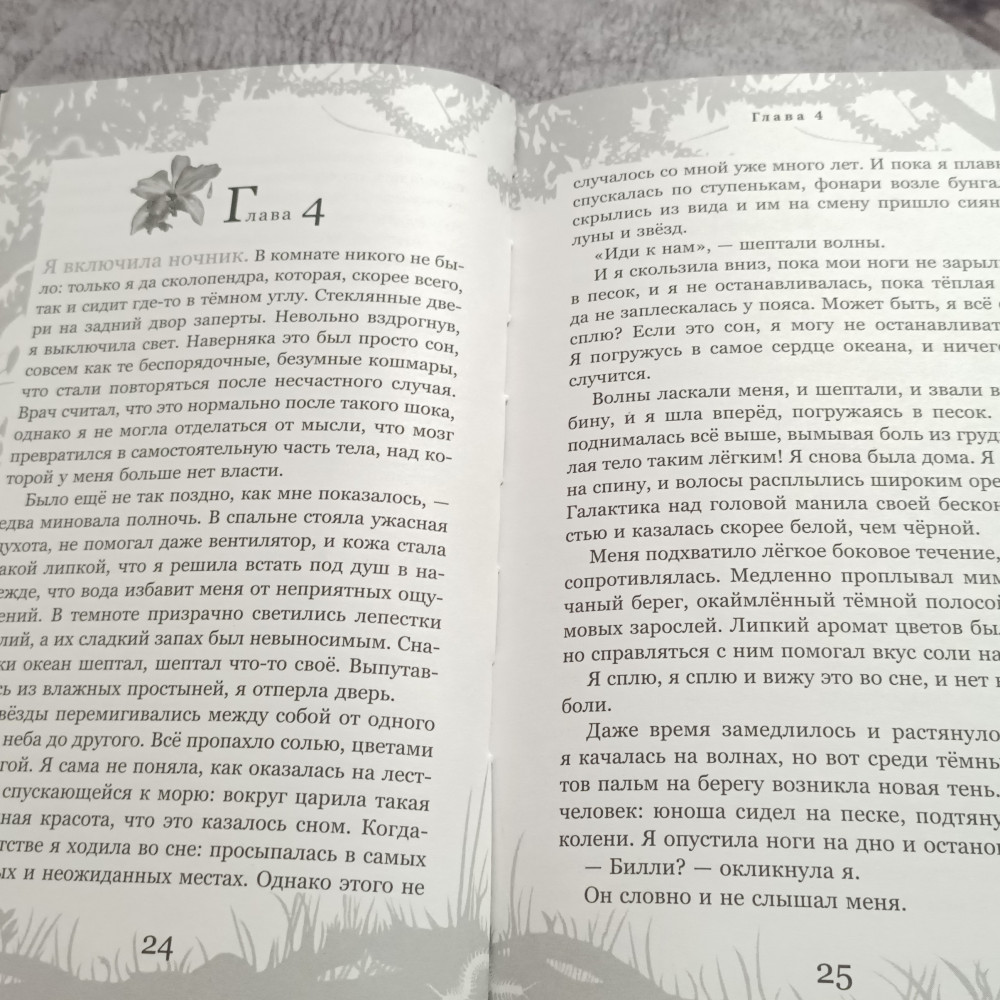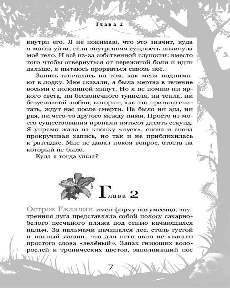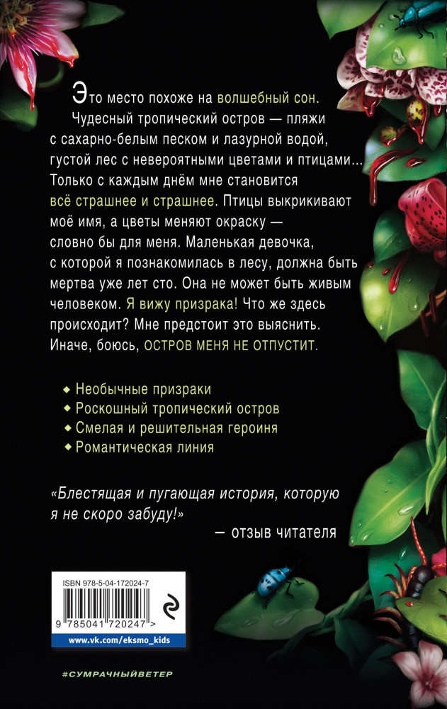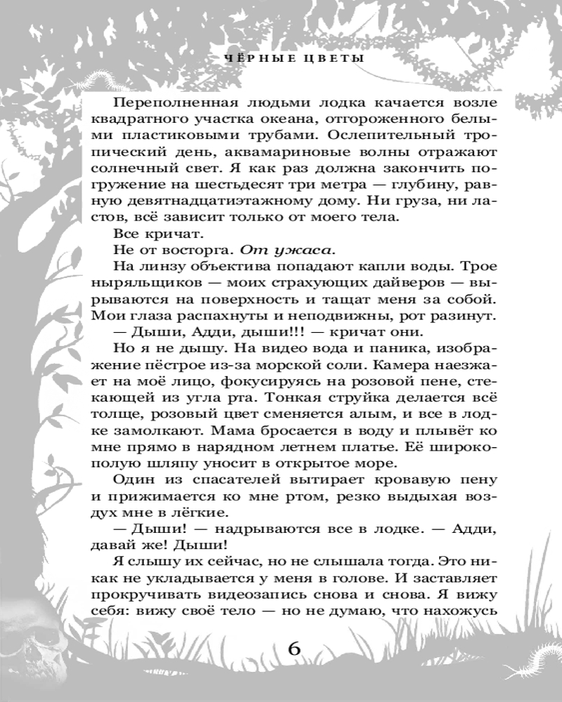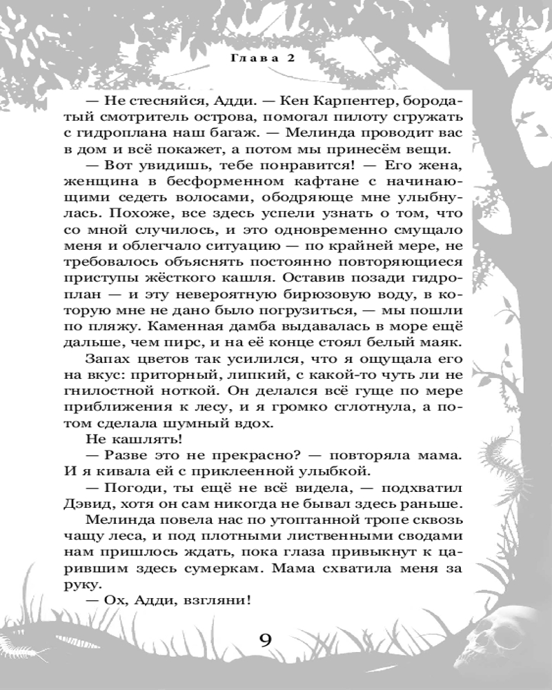 Чёрные цветыВ данный момент этот товар отсутствует в продаже. Возможно, у нас найдется аналогичный или похожий товар здесь. Серия: Сумрачный ветер. Мистика, ужасы, изнанка миров Аделин Спенсер повезло: она осталась жива после несчастного случая на соревнованиях по фридайвингу. Чтобы помочь дочери отдохнуть и отвлечься, мама берёт её в поездку на тропический остров. Адди ждут пляжи с белым песком и лазурной водой, пещера с подземным озером, заросшие лианами развалины старого дома в джунглях... и знакомство с потрясающим парнем. Кажется, даже сам остров рад новой гостье: птицы выкрикивают имя девушки, цветы при её приближении меняют окраску. Это место похоже на волшебный сон, но Адди не может избавиться от тревоги. Ей кажется, что маленькая девочка, которую она видела в лесу, — призрак. И что призраки ещё не самая страшная тайна этого острова... |