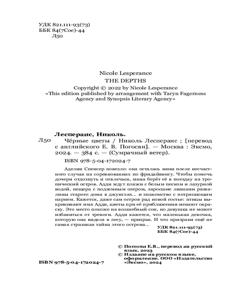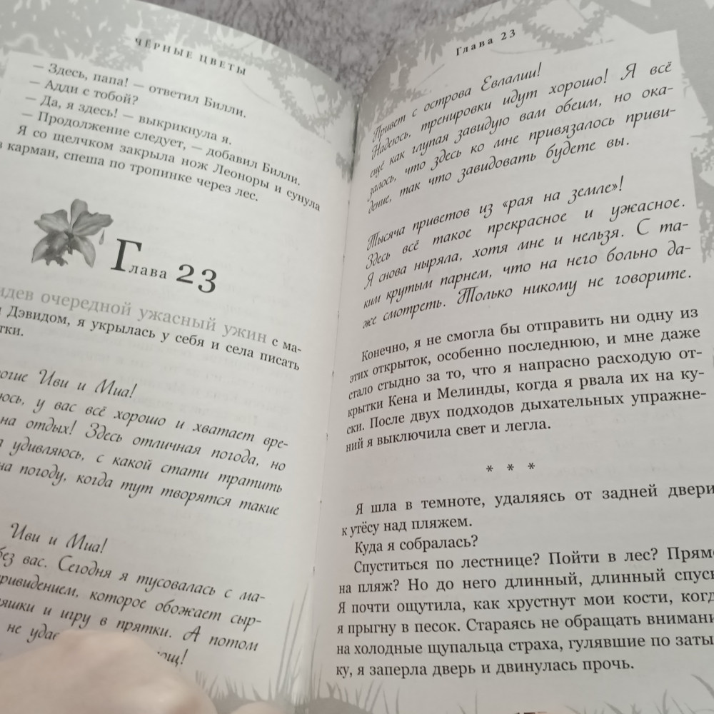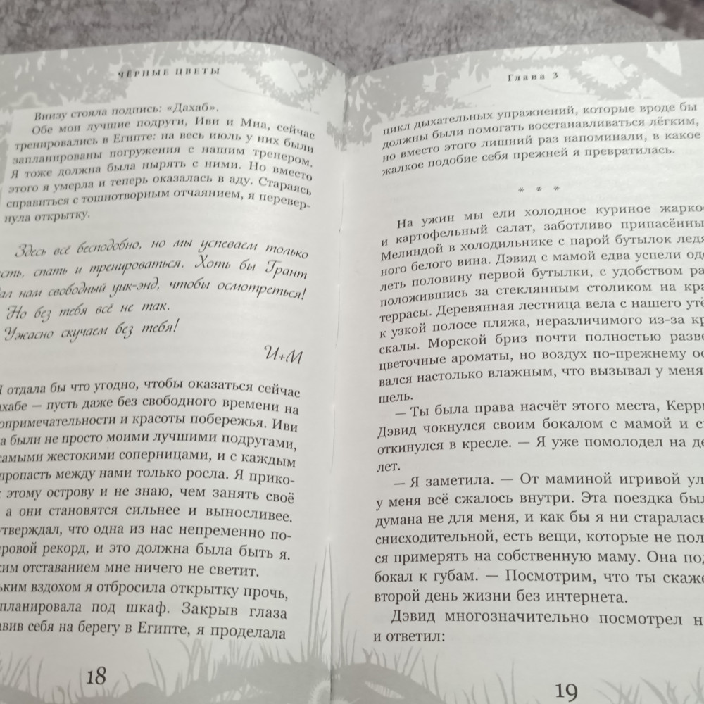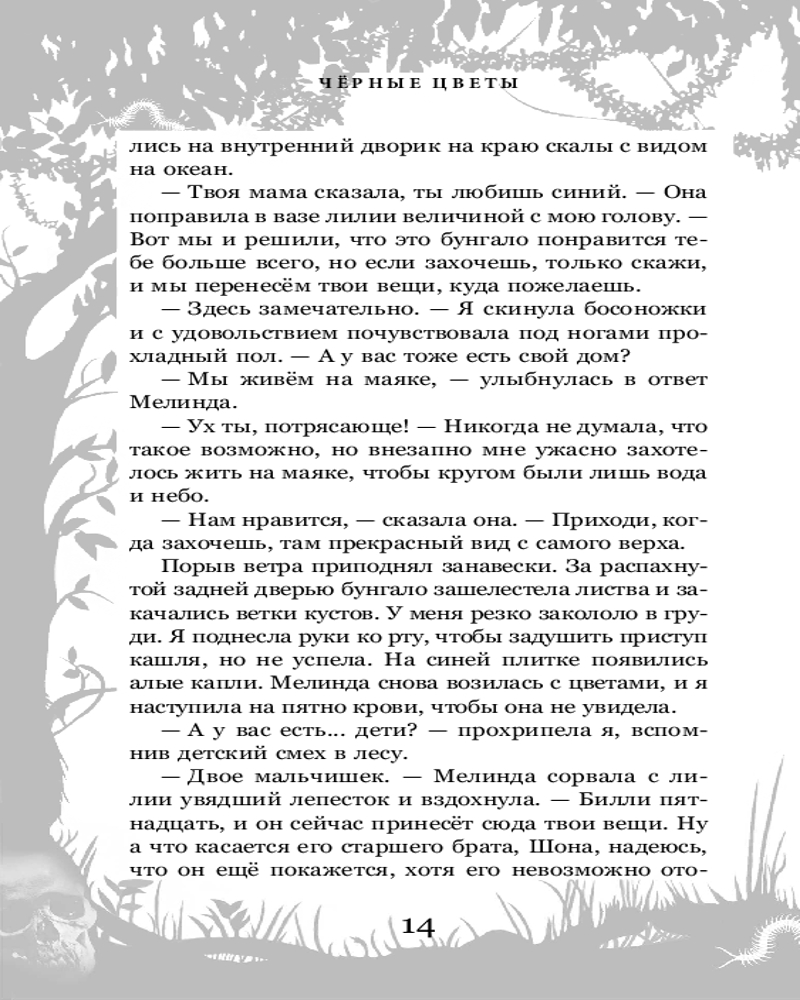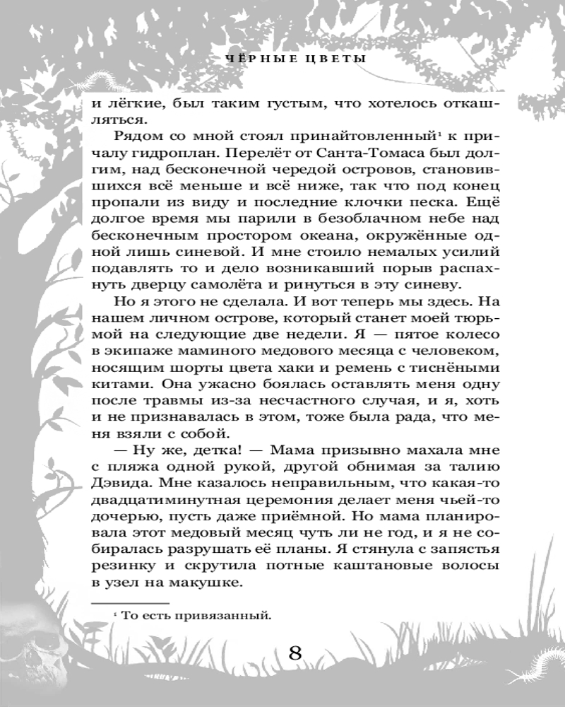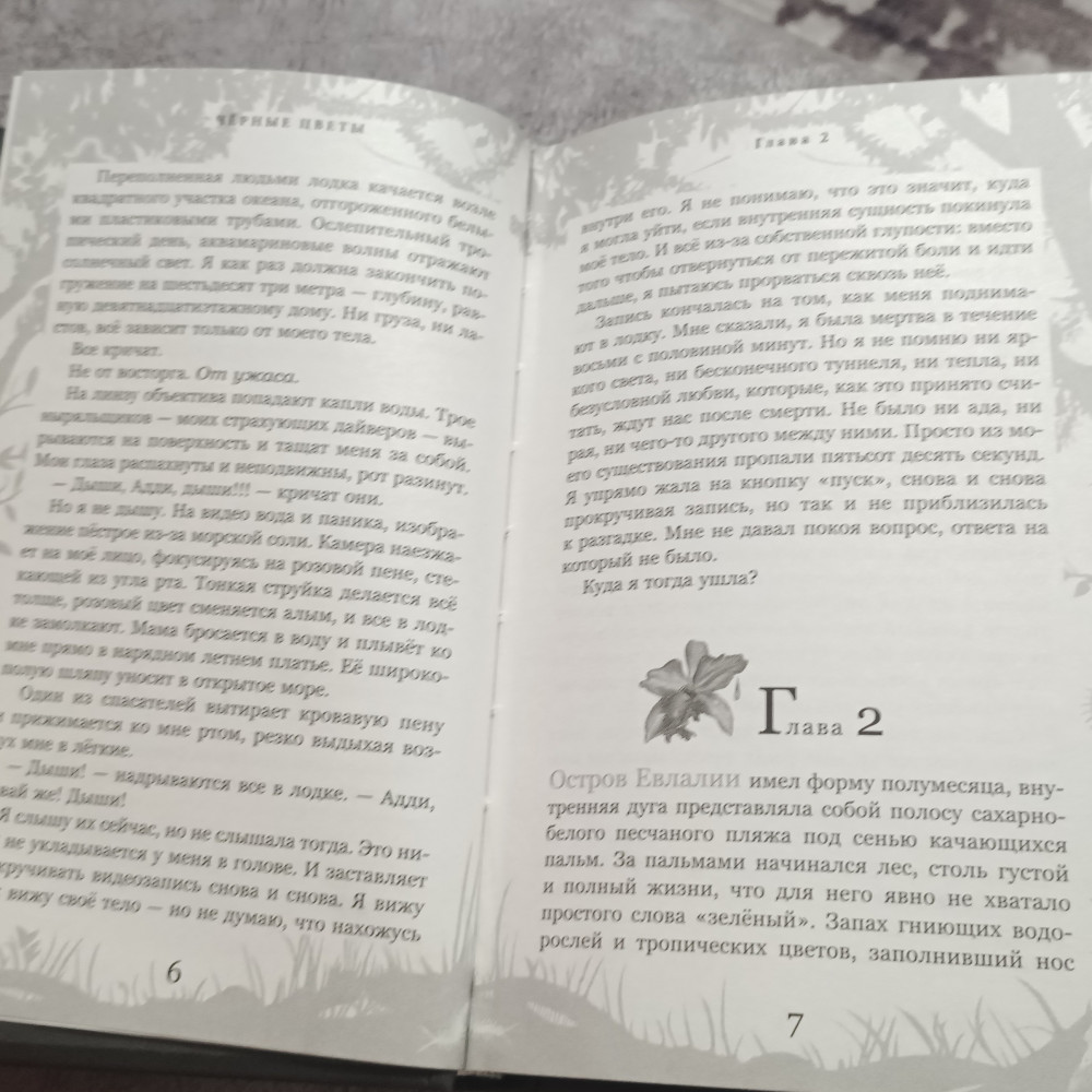 Чёрные цветыВ данный момент этот товар отсутствует в продаже. Возможно, у нас найдется аналогичный или похожий товар здесь. Серия: Сумрачный ветер. Мистика, ужасы, изнанка миров Аделин Спенсер повезло: она осталась жива после несчастного случая на соревнованиях по фридайвингу. Чтобы помочь дочери отдохнуть и отвлечься, мама берёт её в поездку на тропический остров. Адди ждут пляжи с белым песком и лазурной водой, пещера с подземным озером, заросшие лианами развалины старого дома в джунглях... и знакомство с потрясающим парнем. Кажется, даже сам остров рад новой гостье: птицы выкрикивают имя девушки, цветы при её приближении меняют окраску. Это место похоже на волшебный сон, но Адди не может избавиться от тревоги. Ей кажется, что маленькая девочка, которую она видела в лесу, — призрак. И что призраки ещё не самая страшная тайна этого острова... |