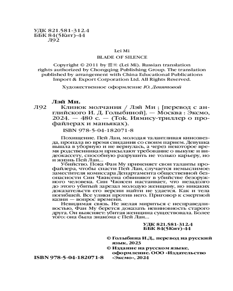💳 Оплатить за товар можно при получении 🇰🇿 Есть бесплатная доставка по Казахстану от 1 дня 🎁 Копите бонусы с каждой покупки Серия: Tok. Иямису-триллер о профайлерах и маньяках Похищение. Пей Лан, молодая, талантливая кинозвезда пропала во время свидания со своим парнем. Девушка вышла в уборную и не вернулась, а через некоторое время родственникам присылают требование о выкупе и видеокассету, способную разрушить Пей Лан не только карьеру, но и жизнь... Убийство. Пока Фан Му прикладывает свои таланты профайлера, чтобы спасти Пей Лан, случается немыслимое: заместителя комиссара Департамента общественной безопасности Син Чжисена обвиняют в убийстве безоружного человека. Син Чжисен настаивает, что незадолго до этого убитый зарезал молодую женщину, но никаких доказательств его версии найти не удается. Как и тела погибшей. Все улики против него. Приговор к смертной казни — вопрос времени. Невидимая связь. Не желая мириться с несправедливостью, Фан Му берется доказать невиновность старого друга. Он выясняет: убитая женщина существовала. Более того: она была знакома с Пей Лан... |