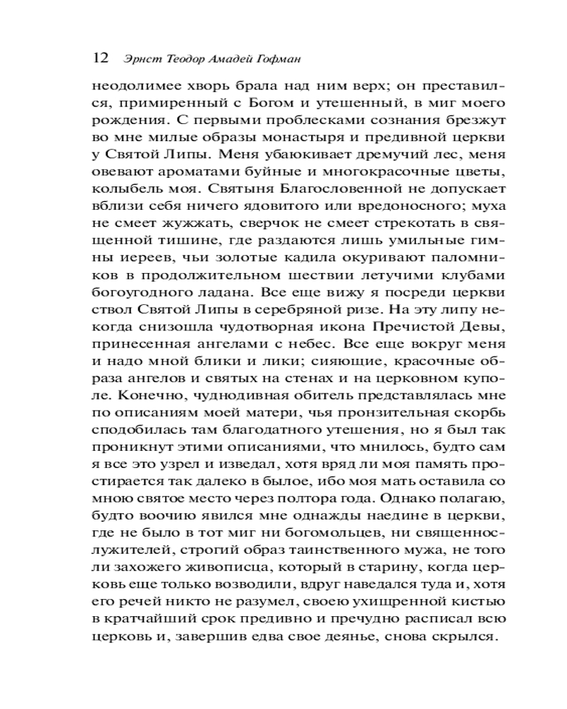 «Эликсиры дьявола» Эрнста Теодора Амадея Гофмана — это произведение, которое погружает читателя в завораживающий и иногда зловещий мир, где реальность переплетается с фантазией. Как покупатель и почитатель литературы, я был очарован мастерством автора в создании ярких образов и запутанных сюжетных линий. Гофман умело играет с человеческими страхами и желаниями, заставляя нас задуматься о природе зла и его соблазнительности. Чтение этой книги — как путешествие по мрачным коридорам человеческой души, где каждый поворот может привести к неожиданным открытиям. Особенно впечатляет способ, которым автор раскрывает внутренние конфликты героев, заставляя нас сопереживать их тревогам и сомнениям. «Эликсиры дьявола» — это не просто история, а глубокое размышление о свободе выбора и последствиях наших поступков. В целом, я остался под впечатлением от стиля Гофмана, его умения комбинировать элементы готики и романтизма. Рекомендую эту книгу всем, кто хочет попробовать свои силы в чтении произведений, полных философских глубин и сложных психологических портретов.