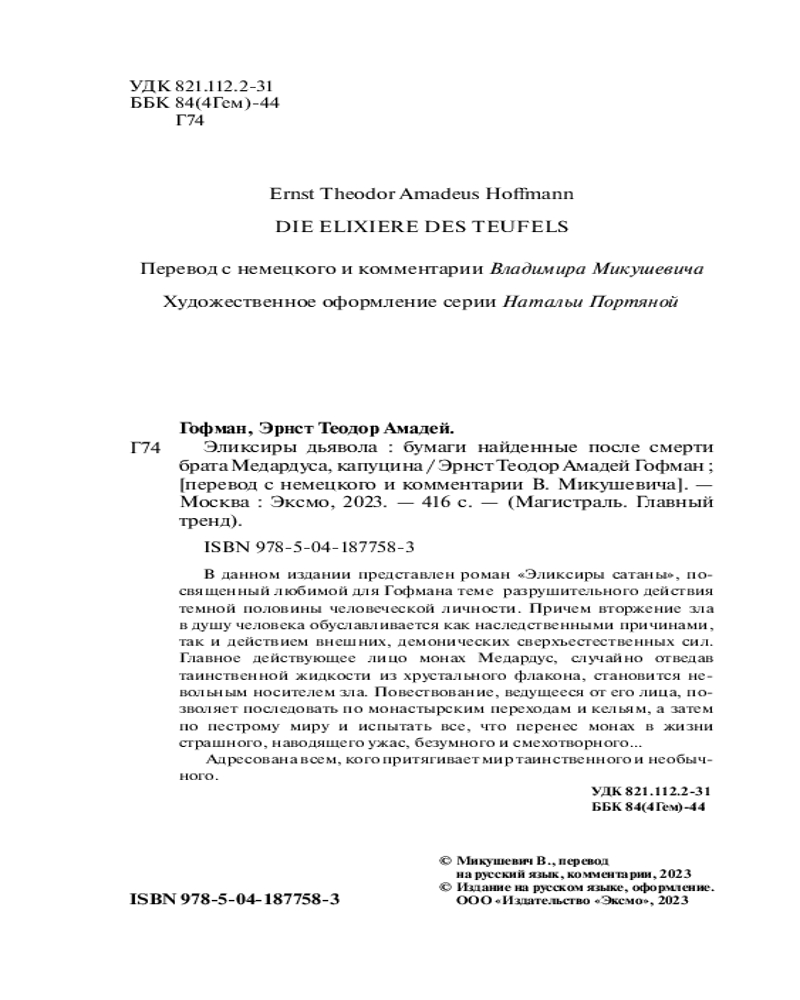 💳 Оплатить за товар можно при получении 🇰🇿 Есть бесплатная доставка по Казахстану от 1 дня 🎁 Копите бонусы с каждой покупки Серия: Магистраль. Главный тренд В данном издании представлен роман «Эликсиры дьявола», посвященный любимой для Гофмана теме разрушительного действия темной половины человеческой личности. Причем вторжение зла в душу человека обуславливается как наследственными причинами, так и действием внешних, демонических сверхъестественных сил. Главное действующее лицо монах Медардус, случайно отведав таинственной жидкости из хрустального флакона, становится невольным носителем зла. Повествование, ведущееся от его лица, позволяет последовать по монастырским переходам и кельям, а затем по пестрому миру, и испытать все, что перенес монах в жизни страшного, наводящего ужас, безумного и смехотворного... |