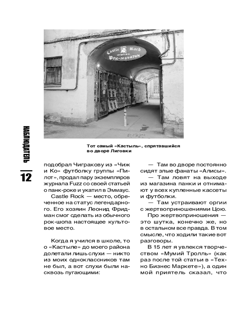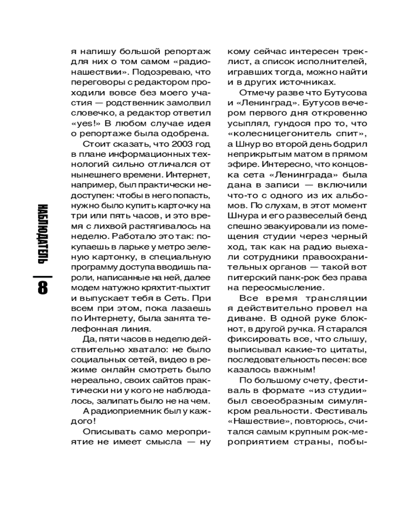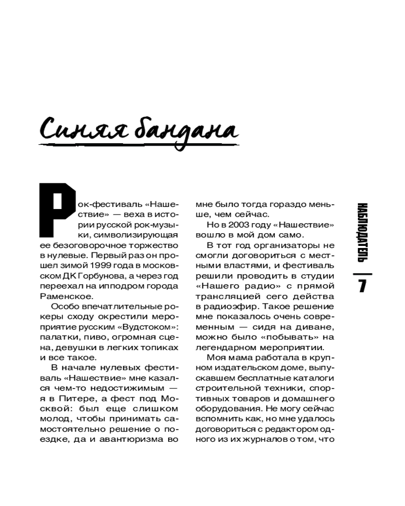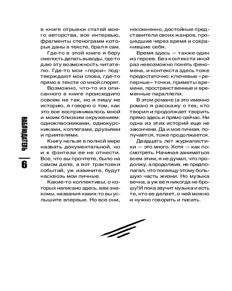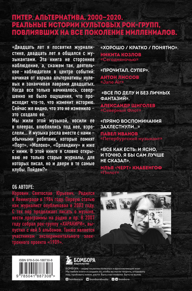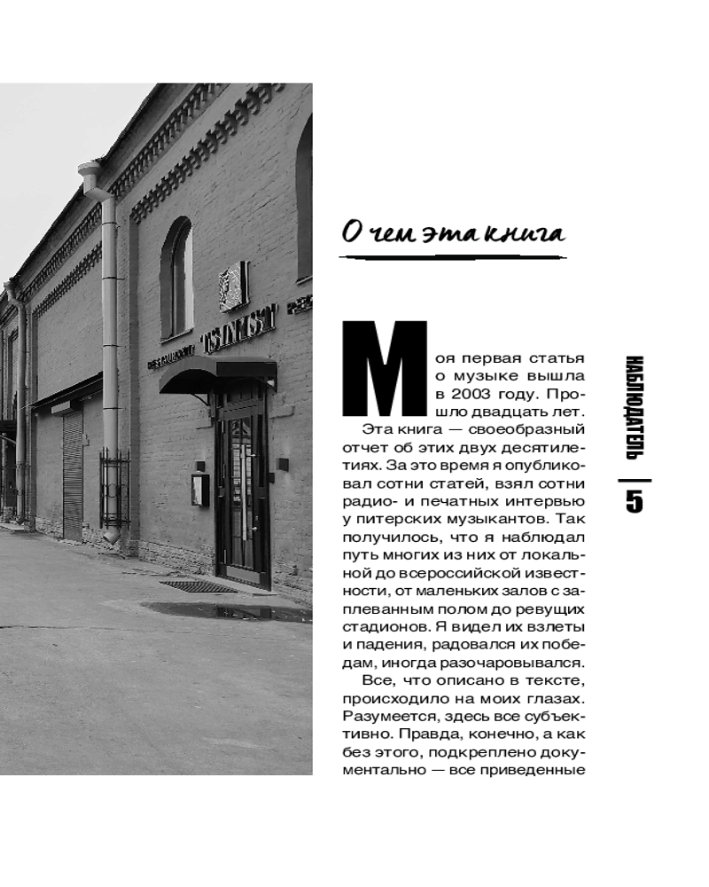 Эта книга не энциклопедия, а срез музыкальной жизни Петербурга и всей отечественной сцены с конца 90-х до сегодняшних дней. Истории «Северного Флота», «Пилота», [AMATORY], Jane Air, Animal Джаz, Торбы-на-Круче, «Психеи» и других знаковых исполнителей здесь рассматриваются от частного к общему, через интервью с участниками групп, авторские зарисовки с концертов, фестивалей и радиоэфиров, личные встречи и беседы с единомышленниками.