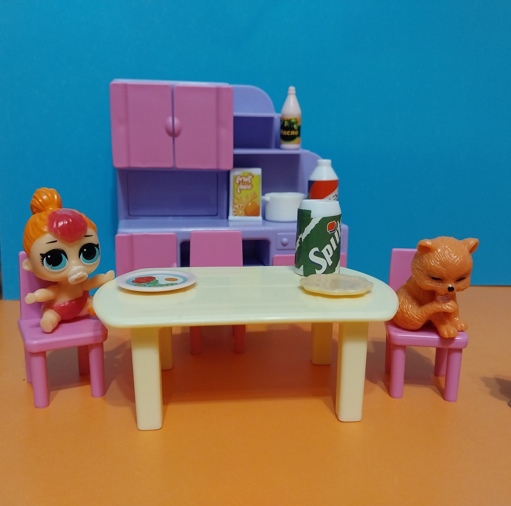 Отличный качественный набор, крепкий пластик, дверцы открываются, стульчики подойдут по размеру для малышек кукол лол или мелких зверьков