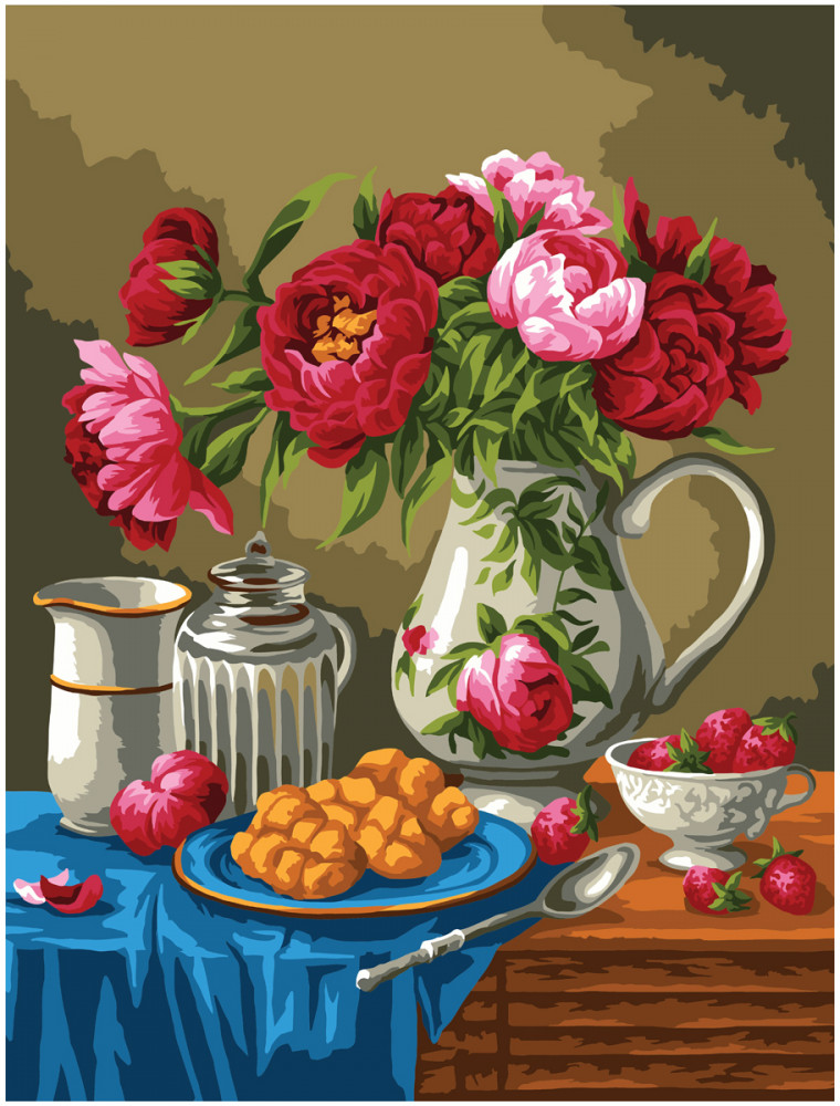 • холст на деревянном подрамнике 40×50 с нанесенным контуром, пронумерованный в соответствии с номерами красок. Контур под раскрашивание нанесен в том числе и на торцы подрамника, что позволяет разместить готовую работу на стене не обрамляя в багет или раму. Технология точной разбивки сюжета картины на разные цветовые оттенки гарантируют правильность исполнения полотна;