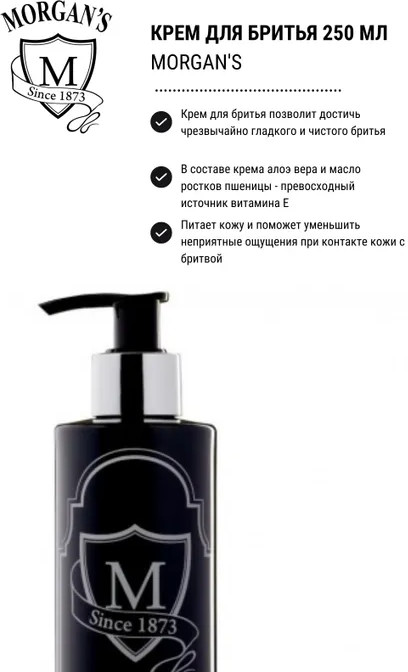 Morgan's Крем для бритьяВ данный момент этот товар отсутствует в продаже. Возможно, у нас найдется аналогичный или похожий товар здесь. Крем для бритья Morgan’s готовит кожу к процедуре бритья, смягчает и приподнимает волоски для более легкого скольжения бритвы, предотвращает появление раздражений. Экстракт алоэ вера и масло зародышей пшеницы (источник витамина Е) питают и увлажняют кожу. Обладает противовоспалительным эффектом и полезен для тех, у кого сухая кожа или есть признаки воспаления, поскольку легко впитывается и удерживает влагу. |