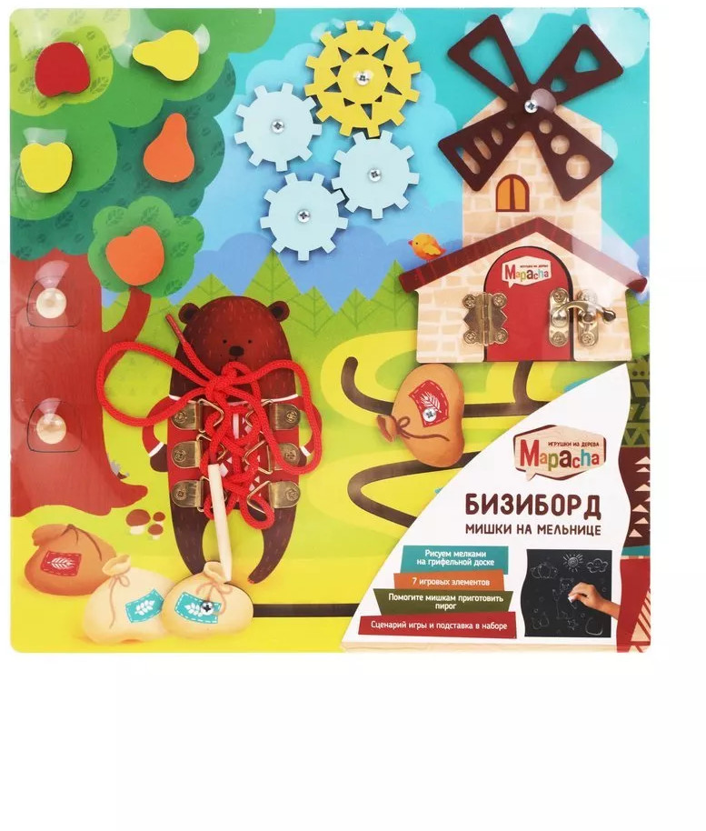 Mapacha Бизиборд «Мишкина мельница»В данный момент этот товар отсутствует в продаже. Возможно, у нас найдется аналогичный или похожий товар здесь. Бизиборд «Мишки на мельнице» — это сразу 7 развивающих элементов для увлекательной игры. Игрушка сочетает в себе лабиринт, защелку, шестеренки, вкладыши, шнуровку, липучки и крутилку. Прочитайте вместе с ребенком сказку-сценарий на внутренней стороне упаковки и разыграйте настоящее представление с использованием элементов бизиборда. Помогите семье медведей приготовить пирог! |