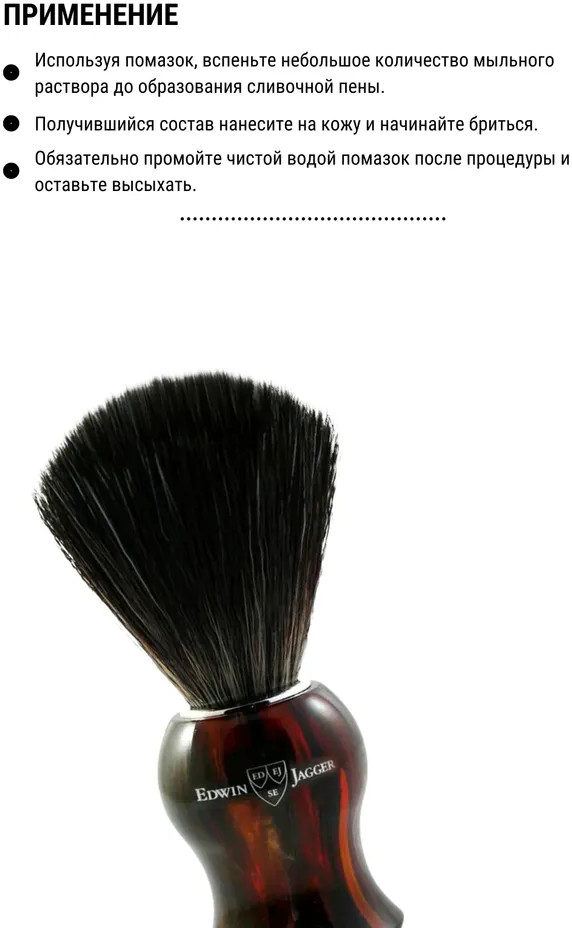Способ применения: в специальной чаше приготовить мыльный раствор и взбить густую пену при помощи помазка. Чтобы продлить срок службы изделия, взбивайте пену круговыми, а не хаотичными движениями. Затем нанесите пенную смесь на кожу лица, и, используя станок Edwin Jagger, приступайте к бритью.