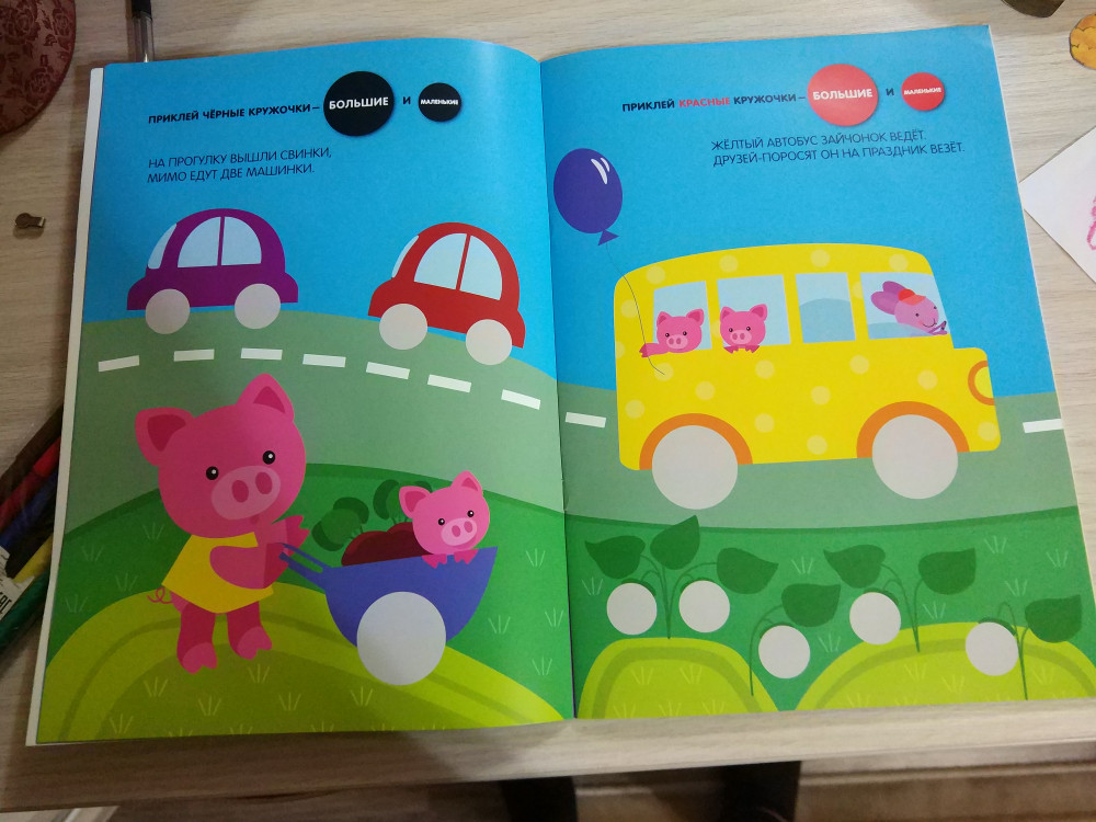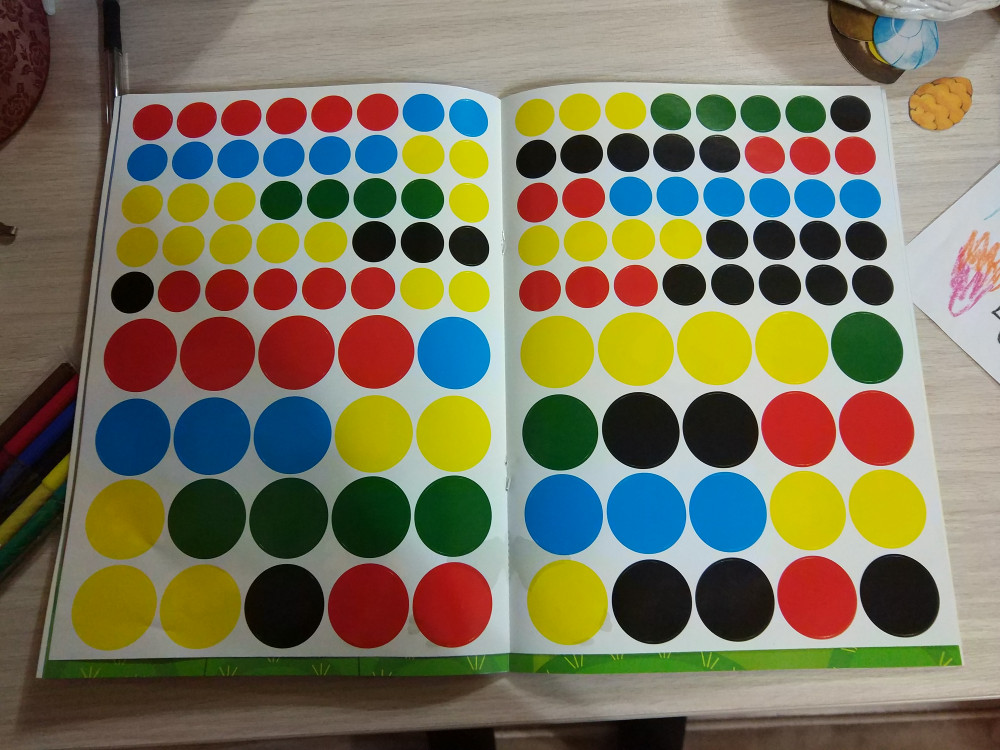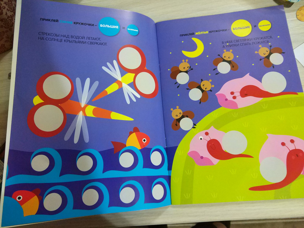 Пока еще не работали с ней. Но уверена, что деткам она понравится. Очень красивая тетрадь с красочными картинками. Хороший материал для изучения цвета, фигуры круг и для мелкой мотороки (отклеивать и клеить).