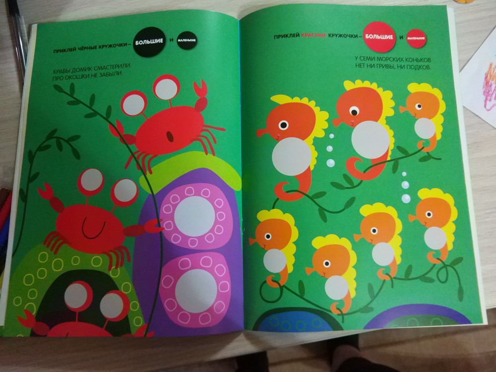 Дочке 1,5 года, наклейки практикуем уже месяца четыре. Уже у неё получается практически аккуратно наклеивать. Из этой серии беру не первую книгу. Отличительной чертой этой серии наклеек является: - большой формат (А4) ; - плотные листы и наклейки; - наличие коротеньких стишков; - большое количество наклеек. А в этой книге, в отличие от других этой же серии, наклейки ещё и разного размера.