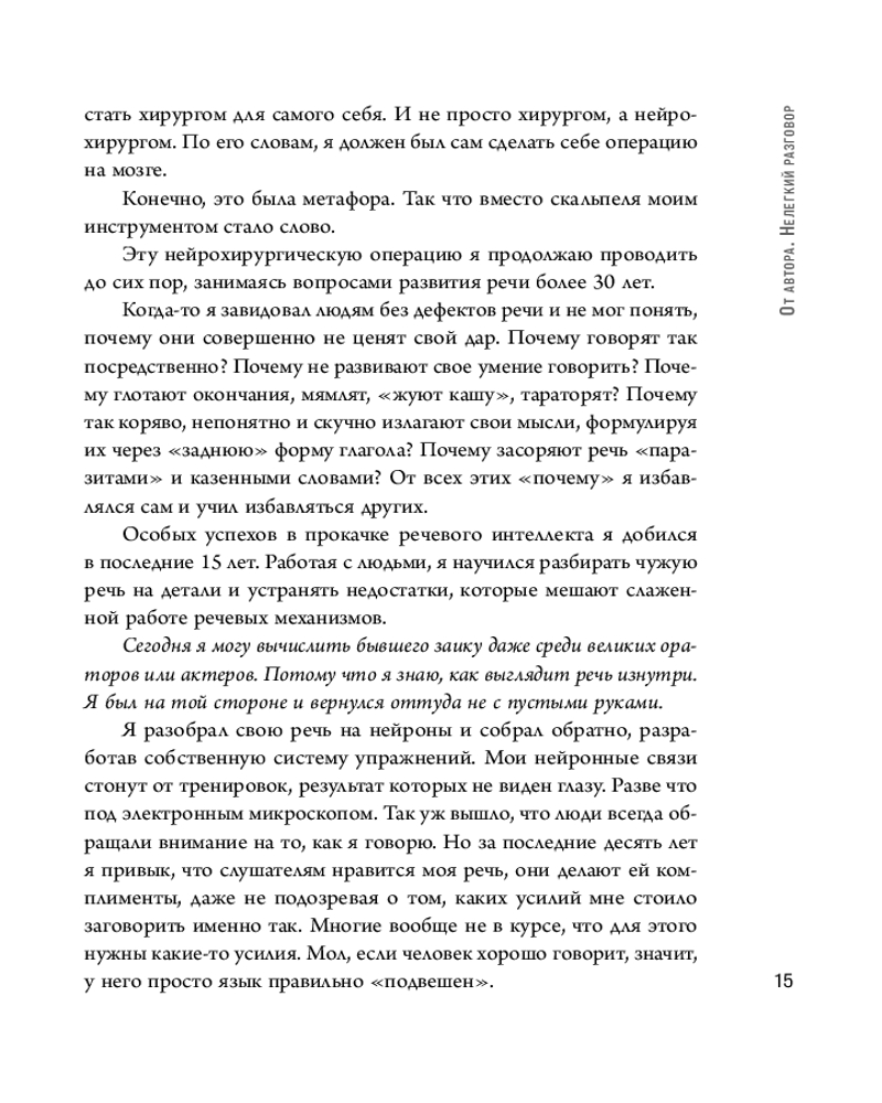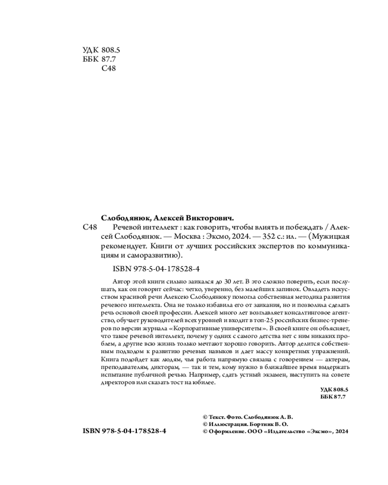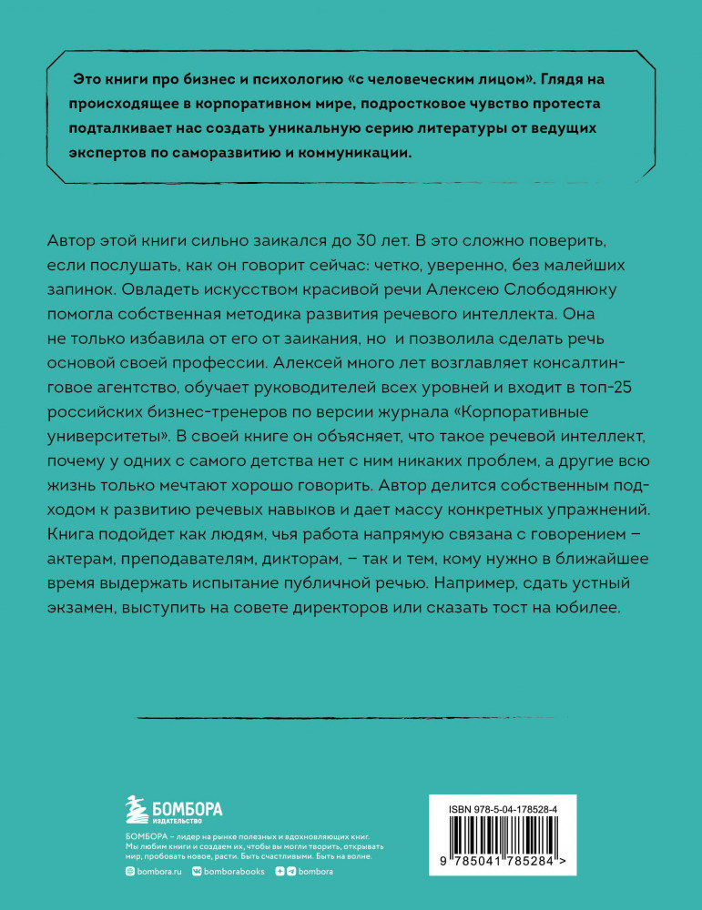 💳 Оплатить за товар можно при получении 🇰🇿 Есть бесплатная доставка по Казахстану от 1 дня 🎁 Копите бонусы с каждой покупки Серия: Мужицкая рекомендует. Книги от лучших российских экспертов по коммуникациям и саморазвитию Автор этой книги сильно заикался до 30 лет. В это сложно поверить, если послушать, как он говорит сейчас: четко, уверенно, без малейших запинок. Овладеть искусством красивой речи Алексею Слободянюку помогла собственная методика развития речевого интеллекта. Она не только избавила от его от заикания, но и позволила сделать речь — основой своей профессии. Алексей много лет возглавляет консалтинговое агентство, обучает руководителей всех уровней и входит в Топ-25 российских бизнес-тренеров, по версии журнала «Корпоративные университеты». В своей книге он объясняет, что такое речевой интеллект, почему у одних с самого детства нет с ним никаких проблем, а другие всю жизнь только мечтают хорошо говорить. |