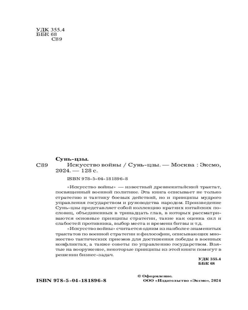 💳 Оплатить за товар можно при получении 🇰🇿 Есть бесплатная доставка по Казахстану от 1 дня 🎁 Копите бонусы с каждой покупки Серия: Искусство побеждать. Сокровища военной истории «Искусство войны» — это мировая классика, написанная древнекитайским стратегом Сунь-цзы. В этой книге он изложил свои мысли и опыт в области ведения войны, которые применялись и изучались в течение многих веков. Сегодня, когда мир стал более технологически развитым и динамичным, принципы, изложенные в «Искусстве войны» Сунь-цзы, остаются как никогда актуальными. Книга сочетает в себе мудрость и опыт по разработке тактики, стратегии, основы психологии ведения войны. В тринадцати главах описаны реалии войны, подходы к выбору лидеров и разработке планов действий, а также методы коммуникации и ведения переговоров. |