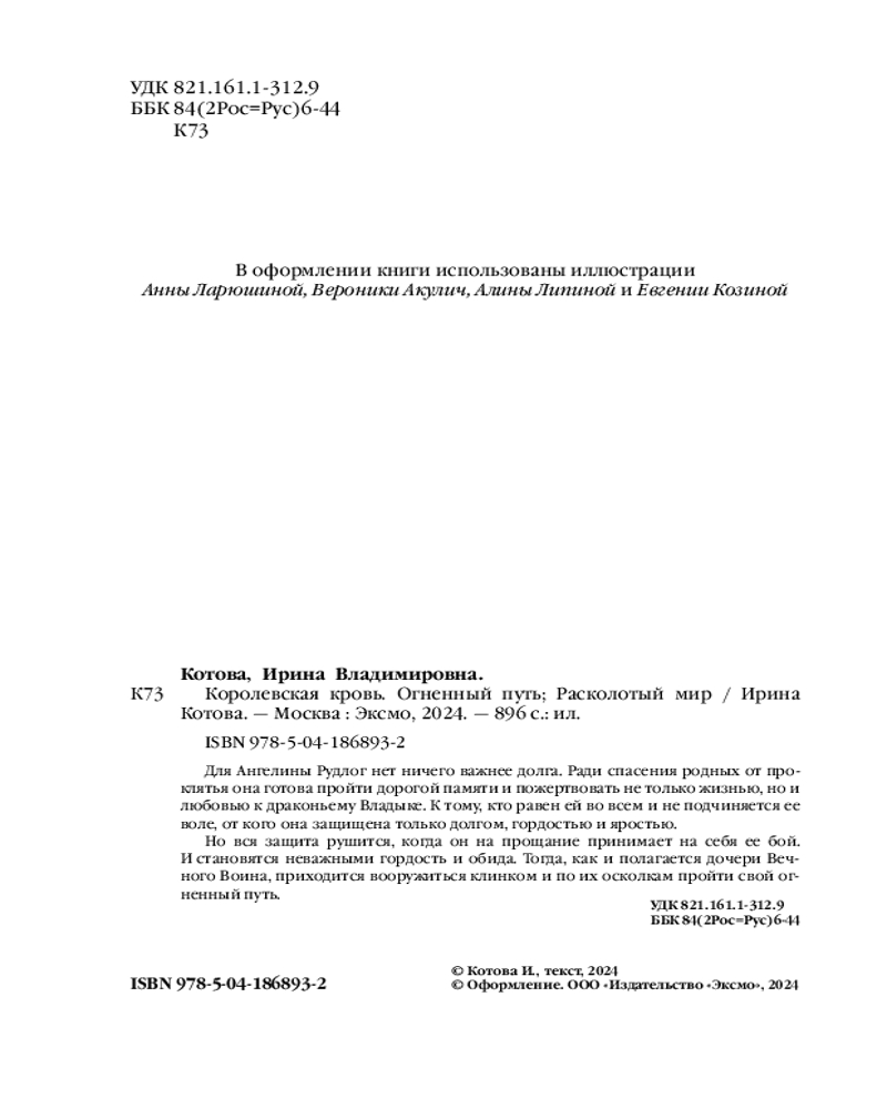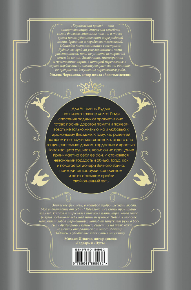 💳 Оплатить за товар можно при получении 🇰🇿 Есть бесплатная доставка по Казахстану от 1 дня 🎁 Копите бонусы с каждой покупки Серия: Королевская кровь. Бестселлеры Ирины Котовой Для Ангелины Рудлог нет ничего важнее долга. Ради спасения родных от проклятья она готова пройти дорогой памяти и пожертвовать не только жизнью, но и любовью к драконьему Владыке. К тому, кто равен ей во всем и не подчиняется ее воле, от кого она защищена только долгом, гордостью и яростью. Но вся защита рушится, когда он на прощание принимает на себя ее бой. И становятся неважными гордость и обида. Тогда, как и полагается дочери Вечного Воина, приходится вооружиться клинком и по их осколкам пройти свой огненный путь. |