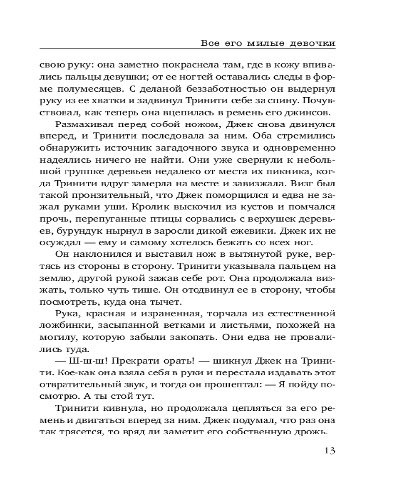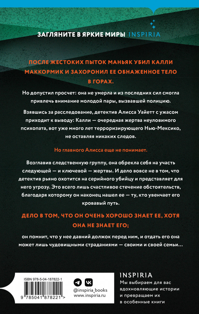 В данный момент этот товар отсутствует в продаже. Возможно, у нас найдется аналогичный или похожий товар здесь. Серия: Tok. Тень маньяка. Лучшие триллеры После жестоких пыток маньяк убил Калли Маккормик и захоронил ее обнаженное тело в горах. Но допустил просчет: она не умерла и из последних сил смогла привлечь внимание молодой пары, вызвавшей полицию. Взявшись за расследование, детектив Алисса Уайетт с ужасом приходит к выводу: Калли — очередная жертва неуловимого психопата, вот уже много лет терроризирующего Нью-Мексико, не оставляя никаких следов.
