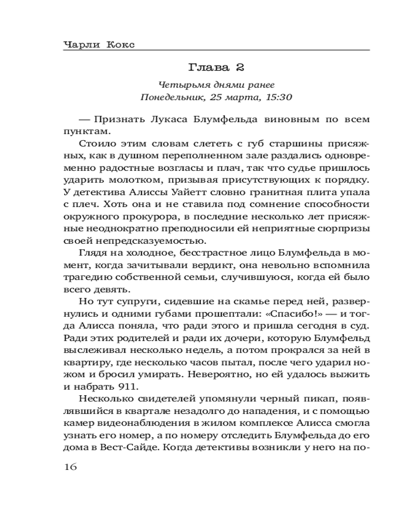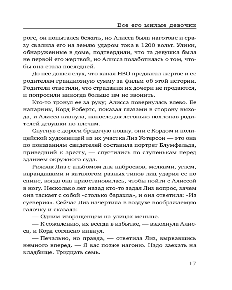 Но главного Алисса еще не понимает. Возглавив следственную группу, она обрекла себя на участь следующей — и ключевой — жертвы. И дело вовсе не в том, что детектив рьяно охотится на серийного убийцу и представляет для него угрозу. Это всего лишь счастливое стечение обстоятельств, благодаря которому он наконец нашел ее — ту, кто увенчает его кровавый путь. Дело в том, что он очень хорошо знает ее, хотя она не знает его; он помнит, что у нее давний должок перед ним, и отдать его она может лишь чудовищными страданиями — своими и своей семьи... |