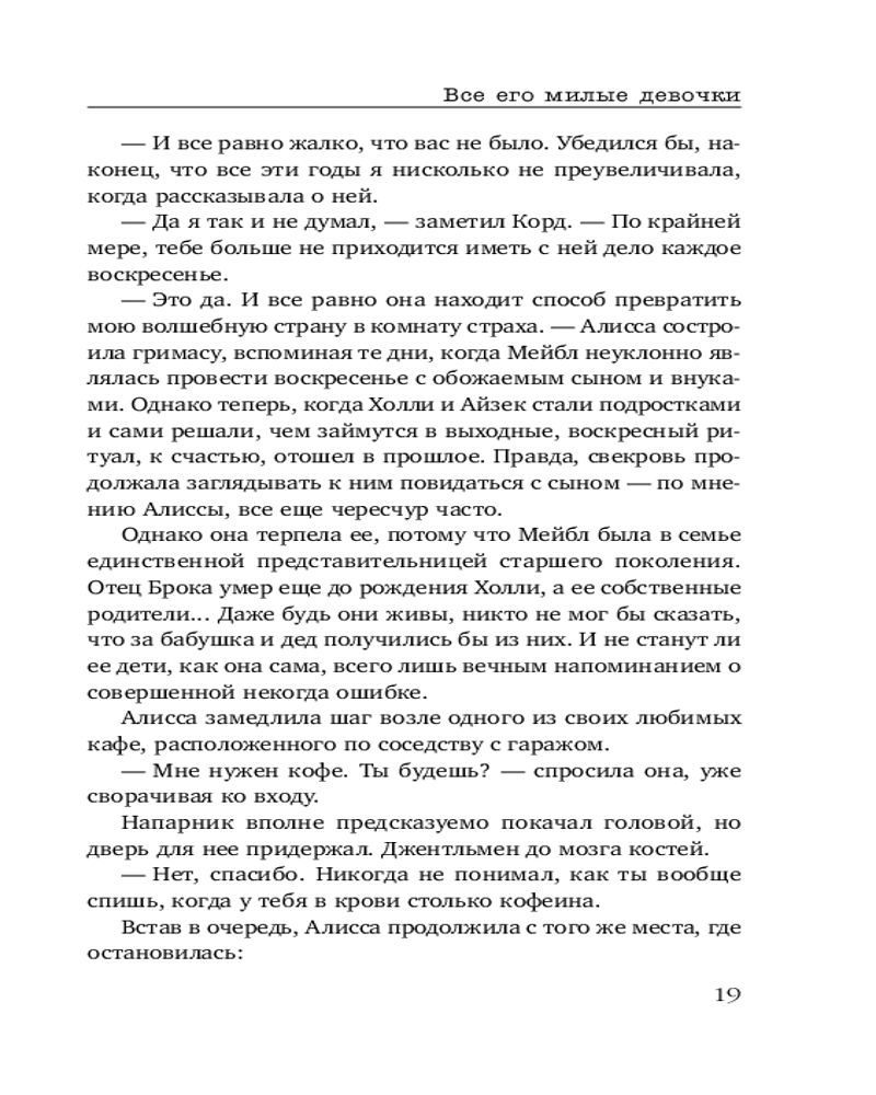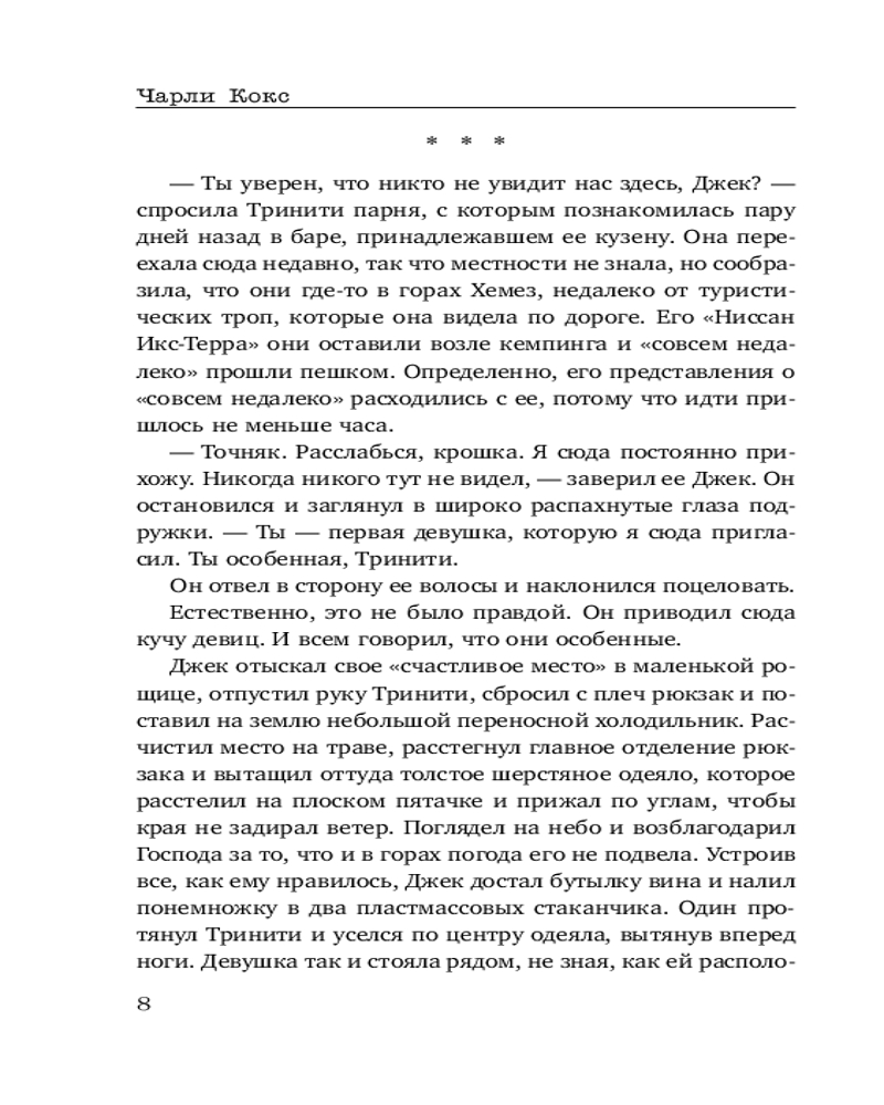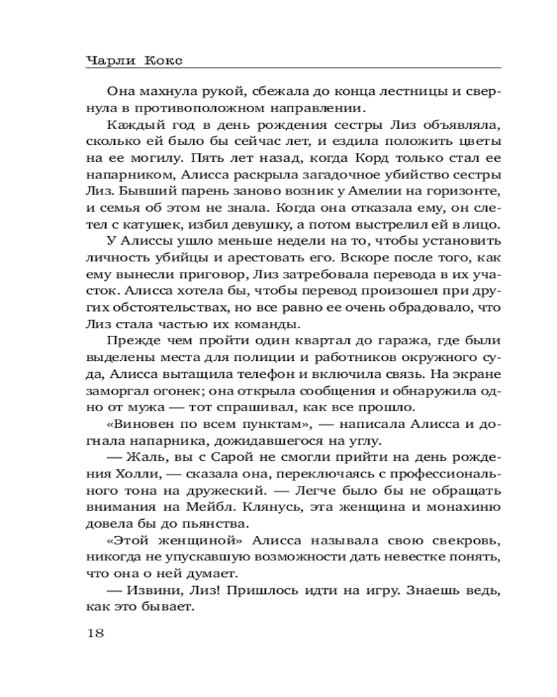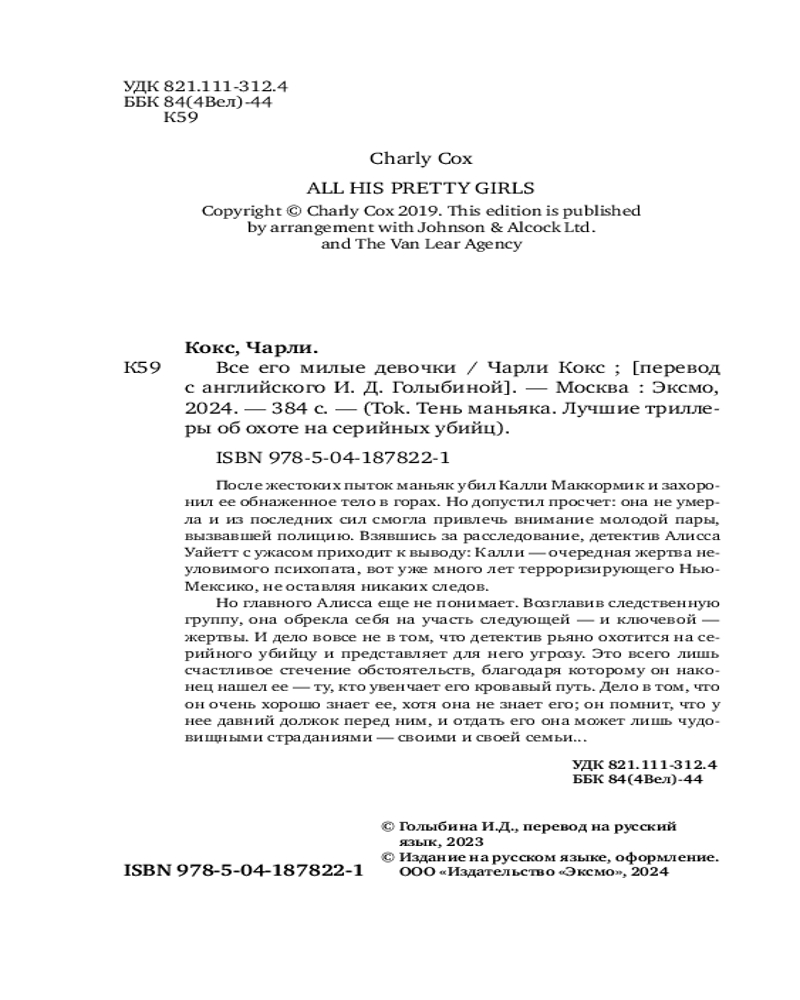 | Чарли Кокс — американская писательница. Чарли родилась родилась на юге, выросла на среднем западе, а сейчас проживает на юго-западе Соединенных Штатов. Получила степень бакалавра по английскому языку и среднему образованию. Свой первый роман-триллер «Все его милые девочки» Кокс издала в октябре 2019 года. Писательница любит острую пищу. Когда она не читает, не пишет и не замышляет ещё одно зловещее злодеяние для своего очередного романа, она любит разгадывать головоломки и кроссворды,... |