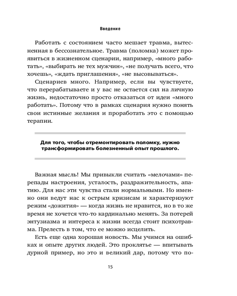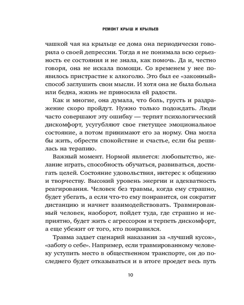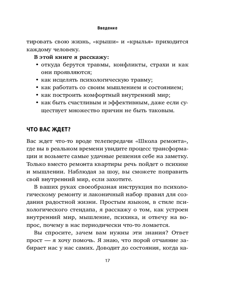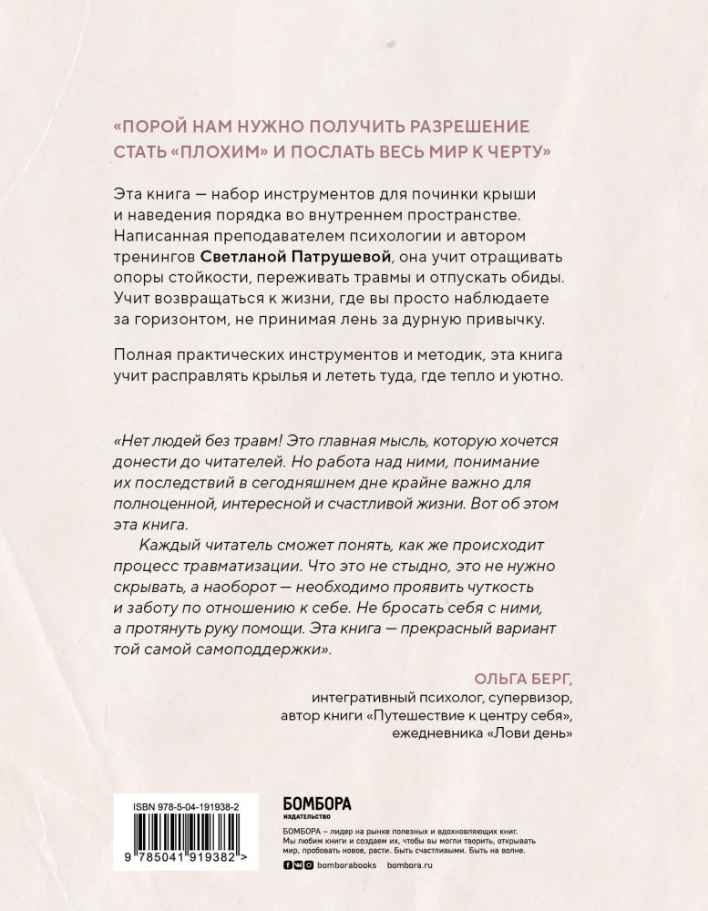 💳 Оплатить за товар можно при получении 🇰🇿 Есть бесплатная доставка по Казахстану от 1 дня 🎁 Копите бонусы с каждой покупки Серия: Хиты саморазвития Эта книга — набор инструментов для починки крыши и наведению порядка во внутренней «детской». Написанная опытным психологом и преподавателем тренингов Светланой Патрушевой, она учит отращивать опоры стойкости, переживать травмы и отпускать обиды. Учит возвращаться к жизни, где вы просто наблюдаете за горизонтом, не принимая лень за дурную привычку. Полная практических инструментов и методик, эта книга учит расправлять крылья и лететь туда, где тепло и уютно. |