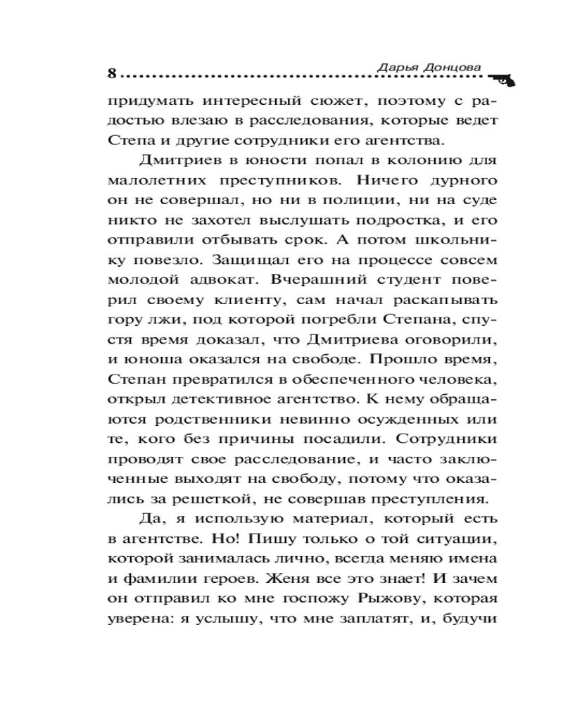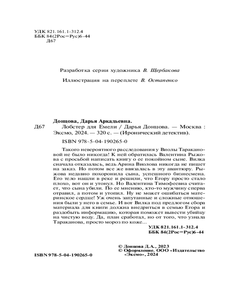 💳 Оплатить за товар можно при получении 🇰🇿 Есть бесплатная доставка по Казахстану от 1 дня 🎁 Копите бонусы с каждой покупки Серия: Иронический детектив Такого невероятного расследования у Виолы Таракановой не было никогда! К ней обратилась Валентина Рыжова с просьбой написать книгу о ее покойном сыне. Вилка сначала отказалась, ведь Арина Виолова никогда не пишет на заказ. Но потом все же ввязалась в эту авантюру. Рыжова недавно похоронила сына, успешного бизнесмена. Его тело нашли в реке, и решили, что Егору просто стало плохо, вот он и утонул. |