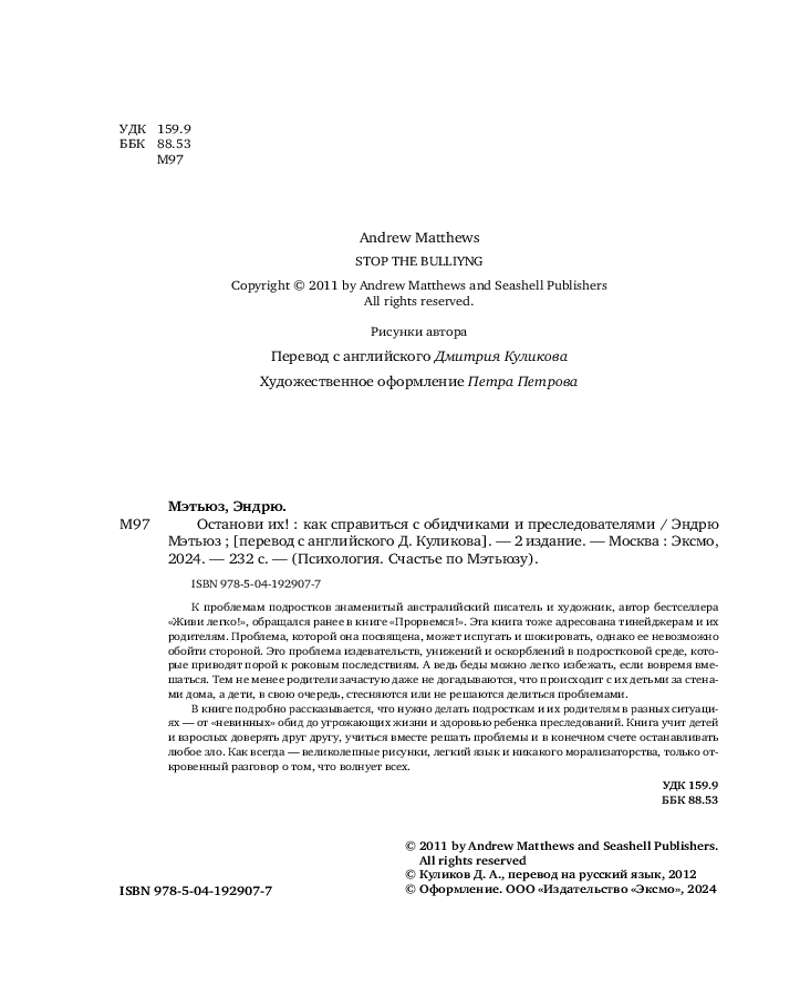 💳 Оплатить за товар можно при получении 🇰🇿 Есть бесплатная доставка по Казахстану от 1 дня 🎁 Копите бонусы с каждой покупки Серия: Психология. Счастье по Мэтьюзу К проблемам подростков знаменитый австралийский писатель и художник, автор бестселлера «Живи легко!», обращался ранее в книге «Прорвемся!». Эта книга тоже адресована тинейджерам и их родителям. Проблема, которой она посвящена, может испугать и шокировать, однако ее невозможно обойти стороной. Это проблема издевательств, унижений и оскорблений в подростковой среде, которые приводят порой к роковым последствиям. А ведь беды можно легко избежать, если вовремя вмешаться. Тем не менее, родители зачастую даже не догадываются, что происходит с их детьми за стенами дома, а дети в свою очередь стесняются или не решаются делиться проблемами. |