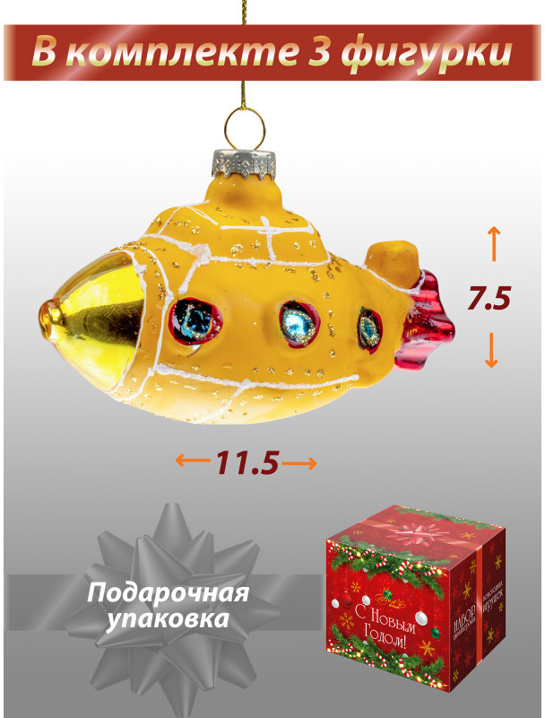 Art of Dream Набор новогодних игрушек «Подводная лодка»В данный момент этот товар отсутствует в продаже. Возможно, у нас найдется аналогичный или похожий товар здесь. Праздник Нового Года невозможно представить без волшебства и блеска, а наши стеклянные новогодние игрушки – настоящее воплощение этого волшебства! Изящные и нежные, эти игрушки станут настоящим украшением вашей новогодней елки. Выполненные из прочного стекла, они надолго сохранят свою яркость и красоту, и каждый год будут радовать вас своим блеском. |