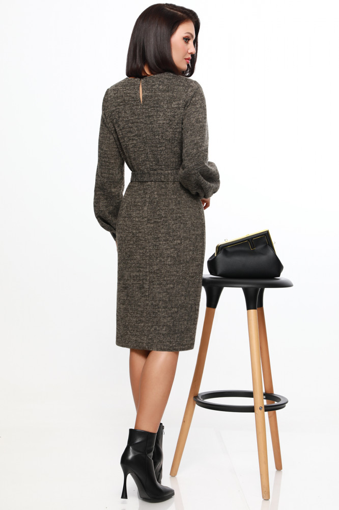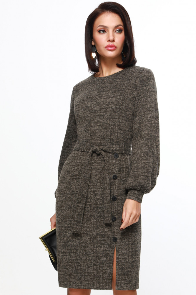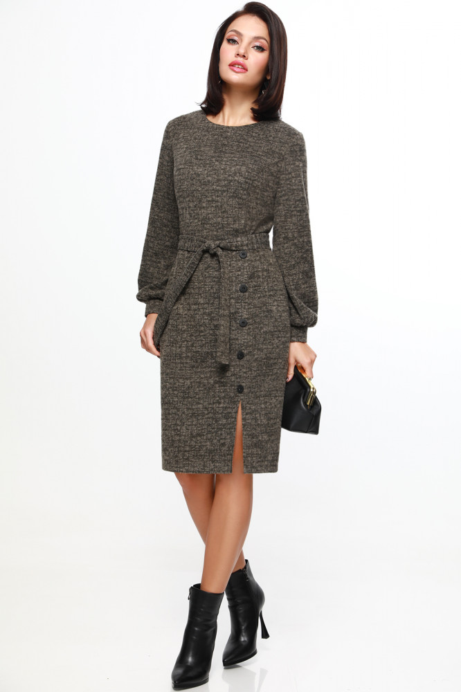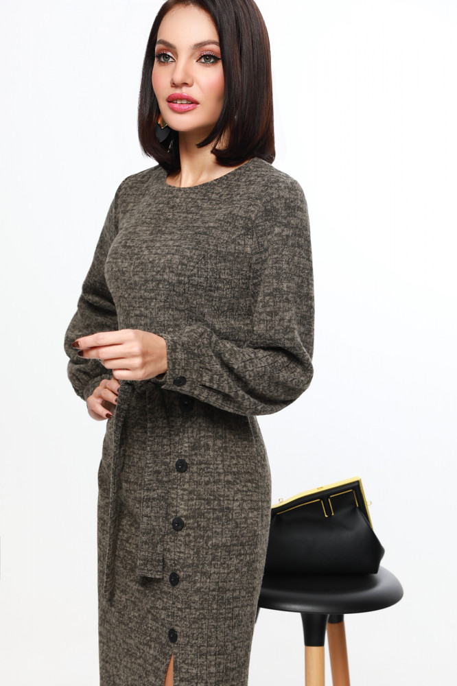 Платье трикотажное с разрезом. Модель полуприлегающего силуэта. Округлый вырез горловины. Рукав втачной длинный, на манжете. Застёжка по спинке на пуговицу. По переду декоративные пуговицы. В комплекте пояс из основной ткани. Практичная модель на каждый день.